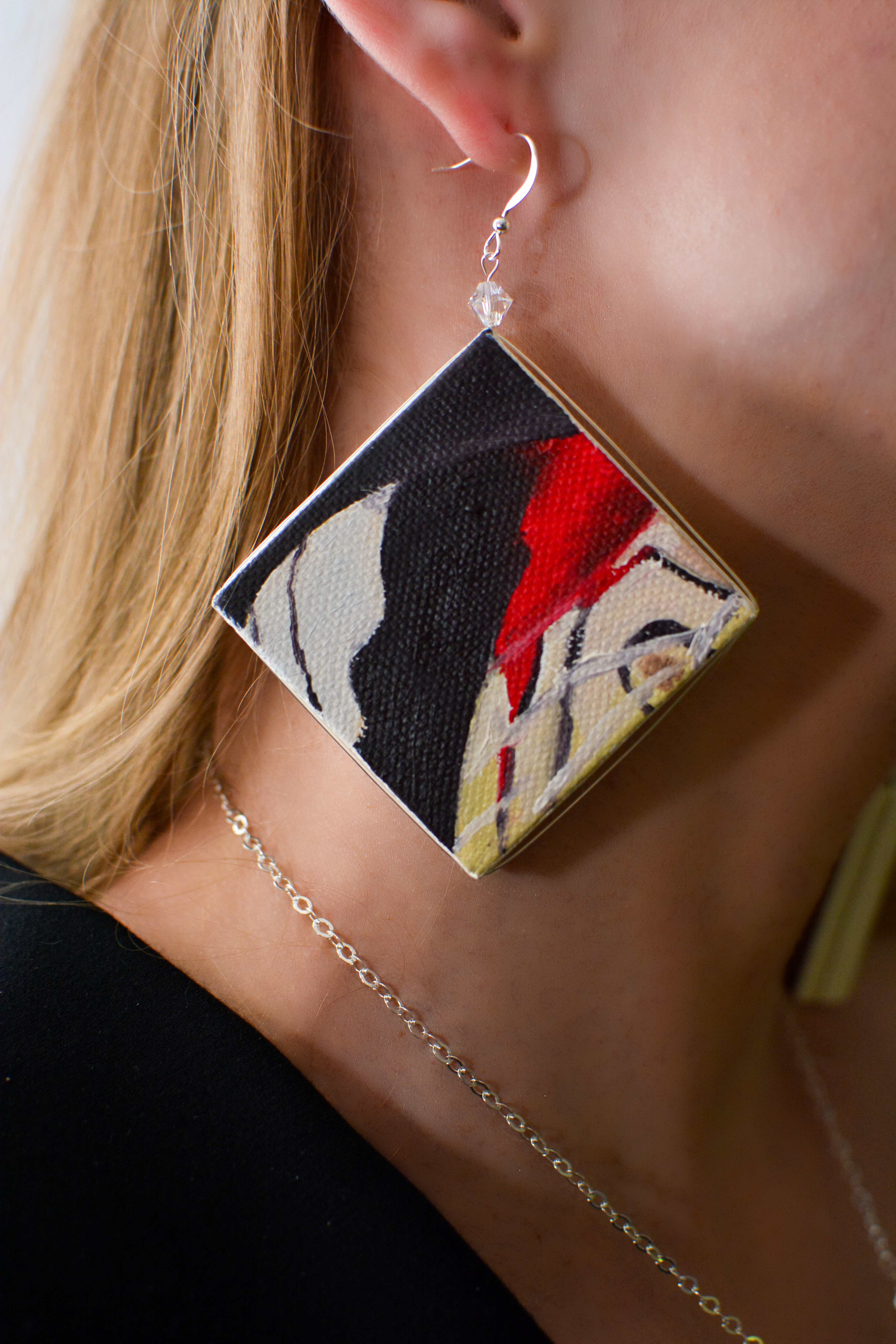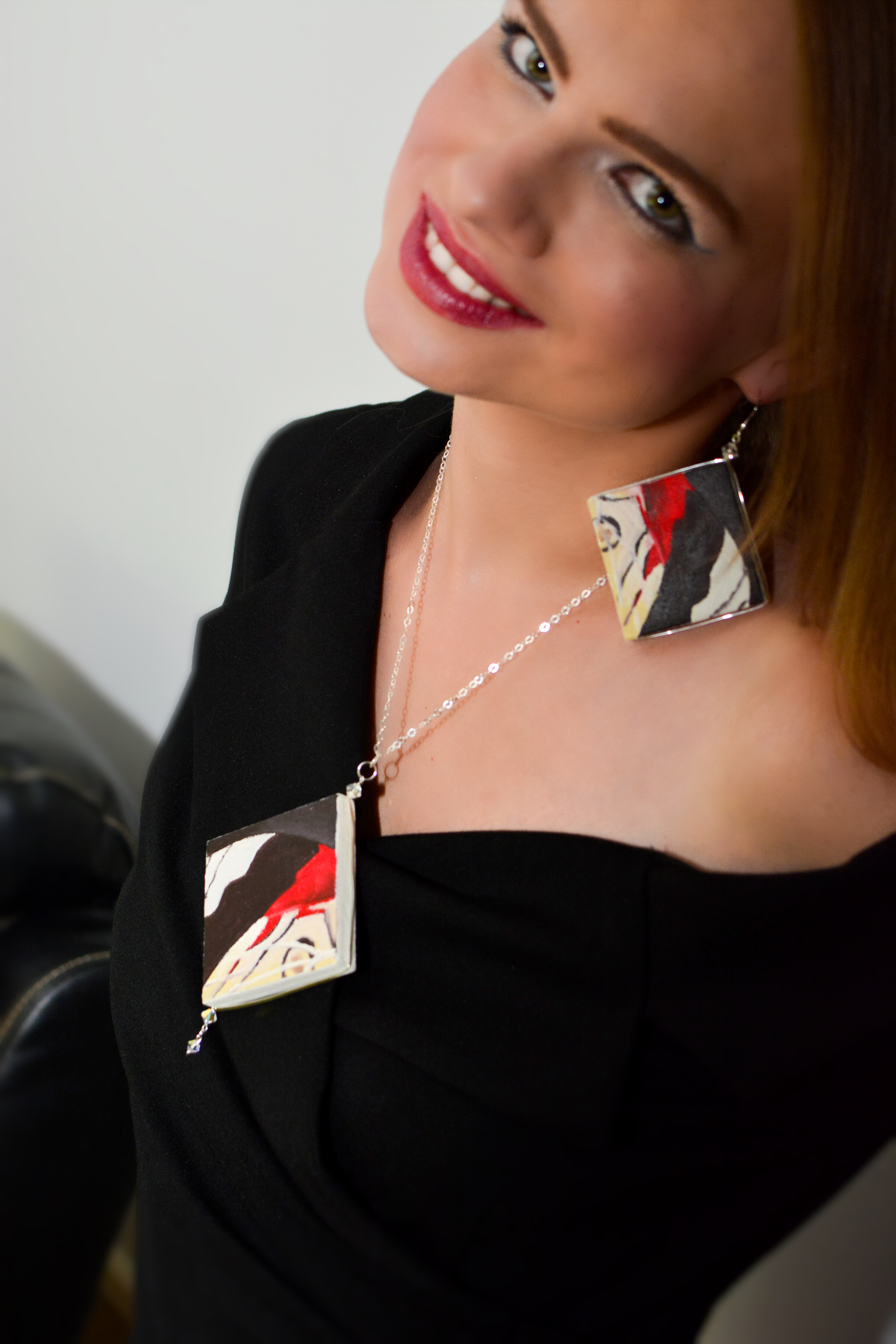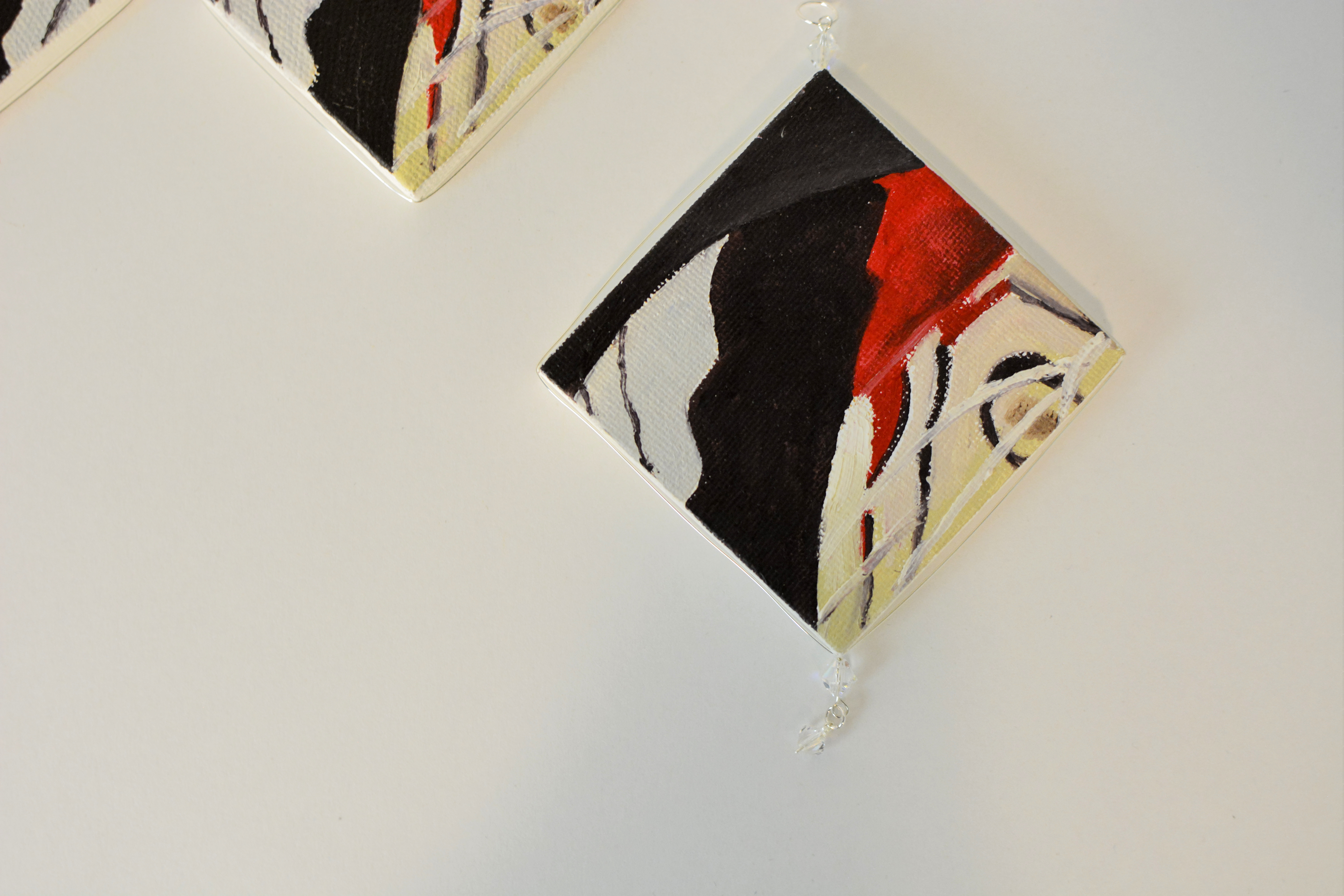 Dziewiątym zestawem biżuterii malarskiej jaki prezentuje jest ,,Motyl X”. W tym zestawie elementy metalowe wykonane są ze srebra. Dla pogłębienia kontrastu zastosowałam lustra.