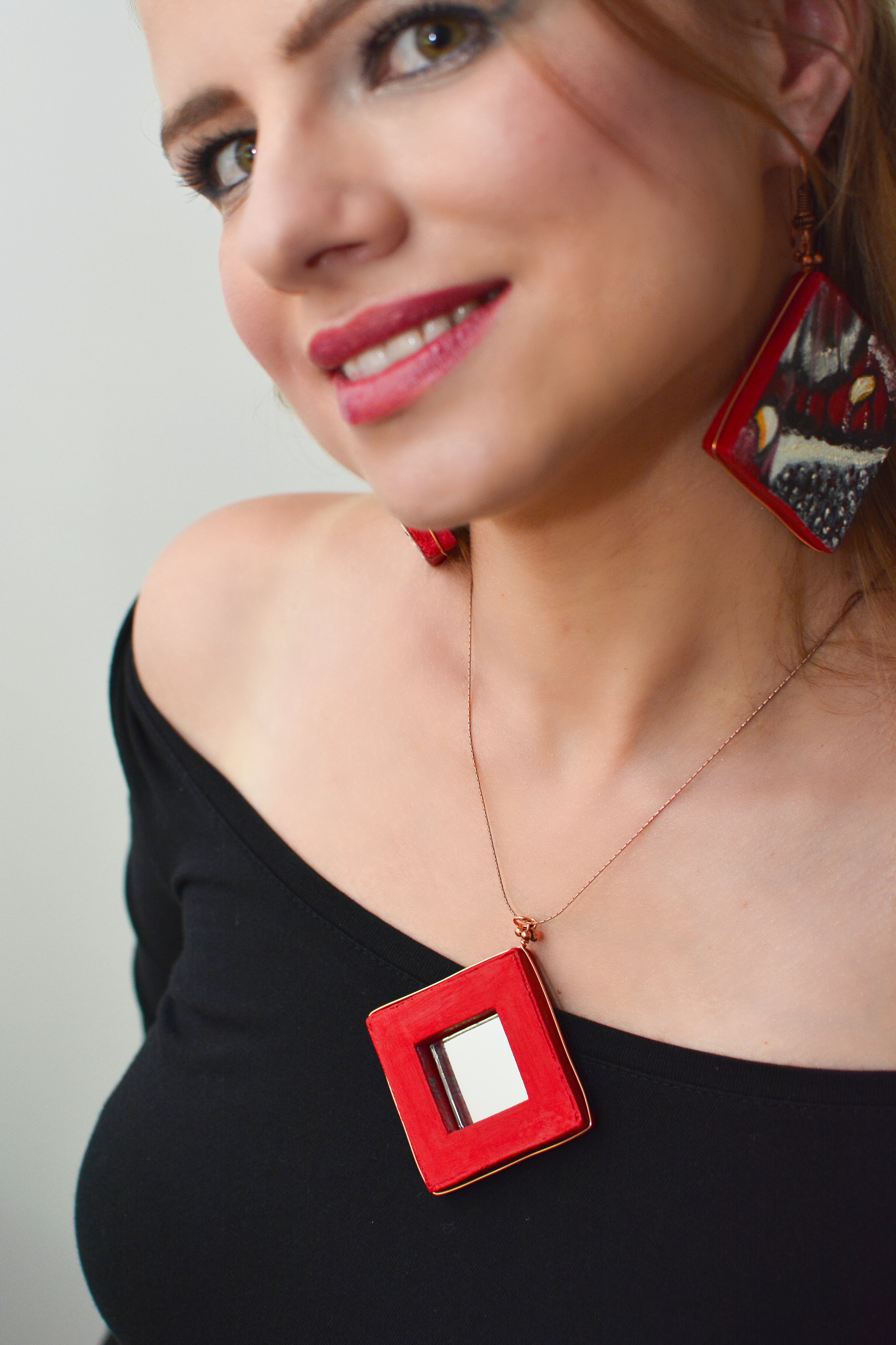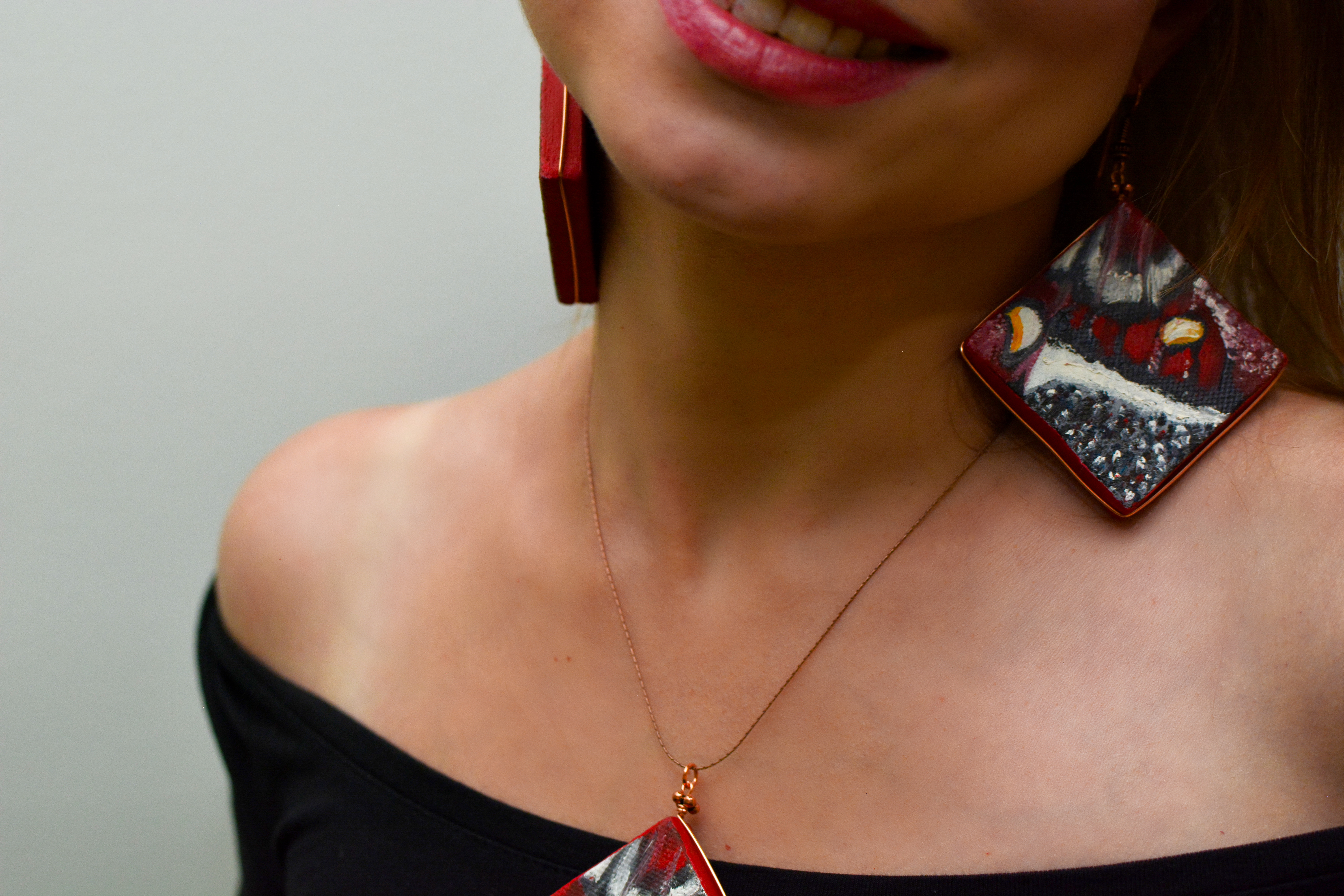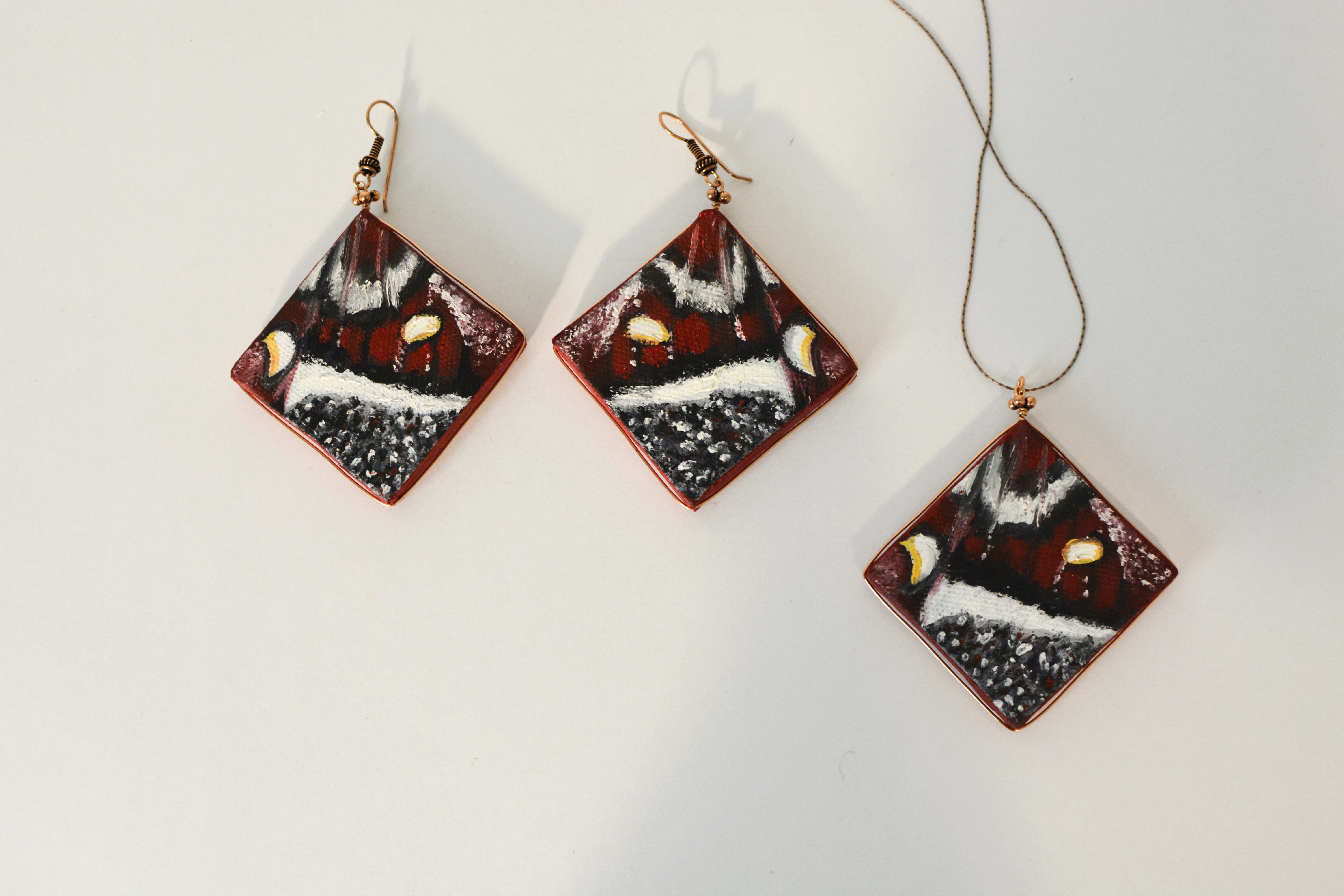 Jedenastym zestawem biżuterii malarskiej jaki prezentuje jest ,,Motyl XI”. W tym zestawie elementy metalowe wykonane są z miedzi. Dla pogłębienia kontrastu zastosowałam lustra.