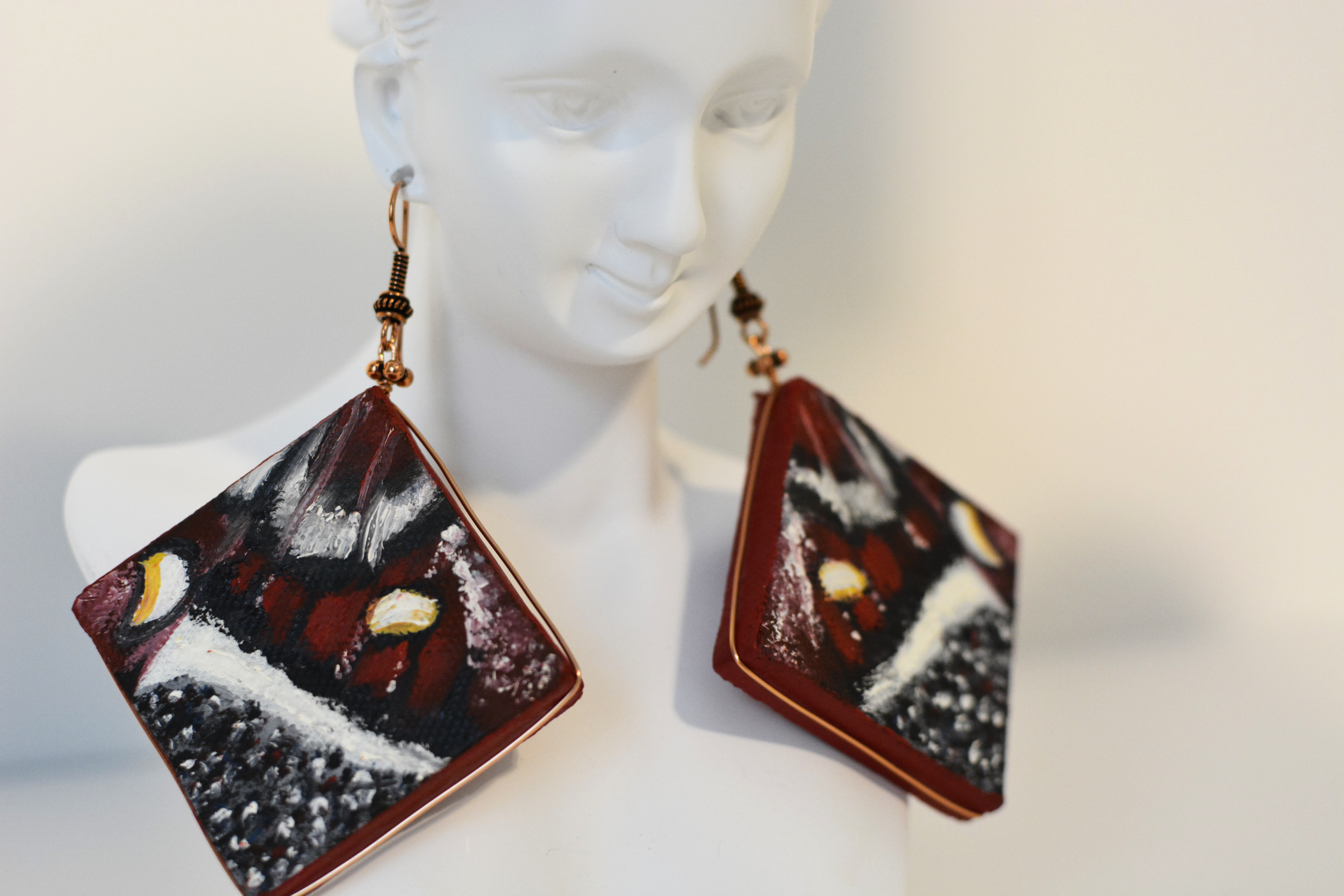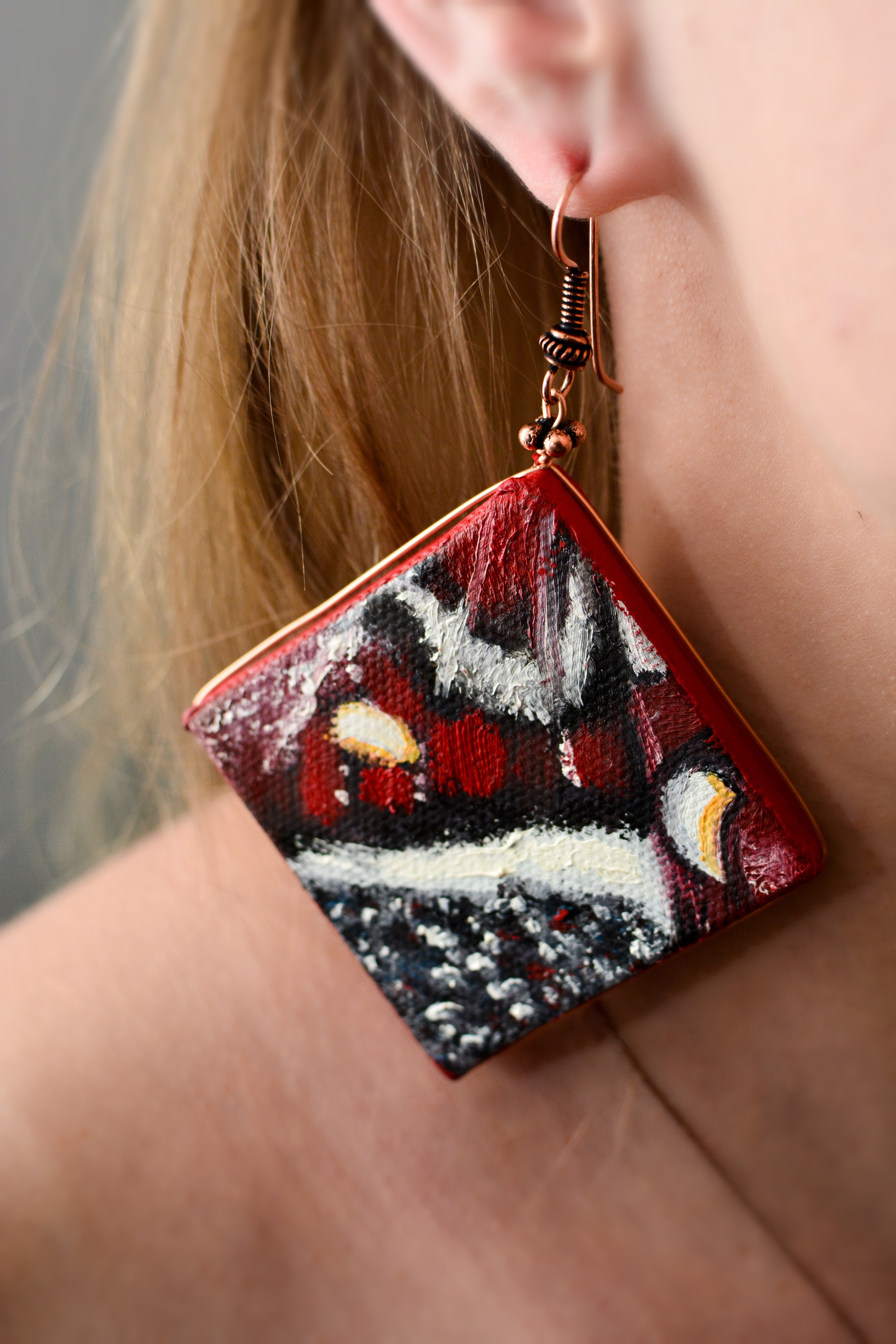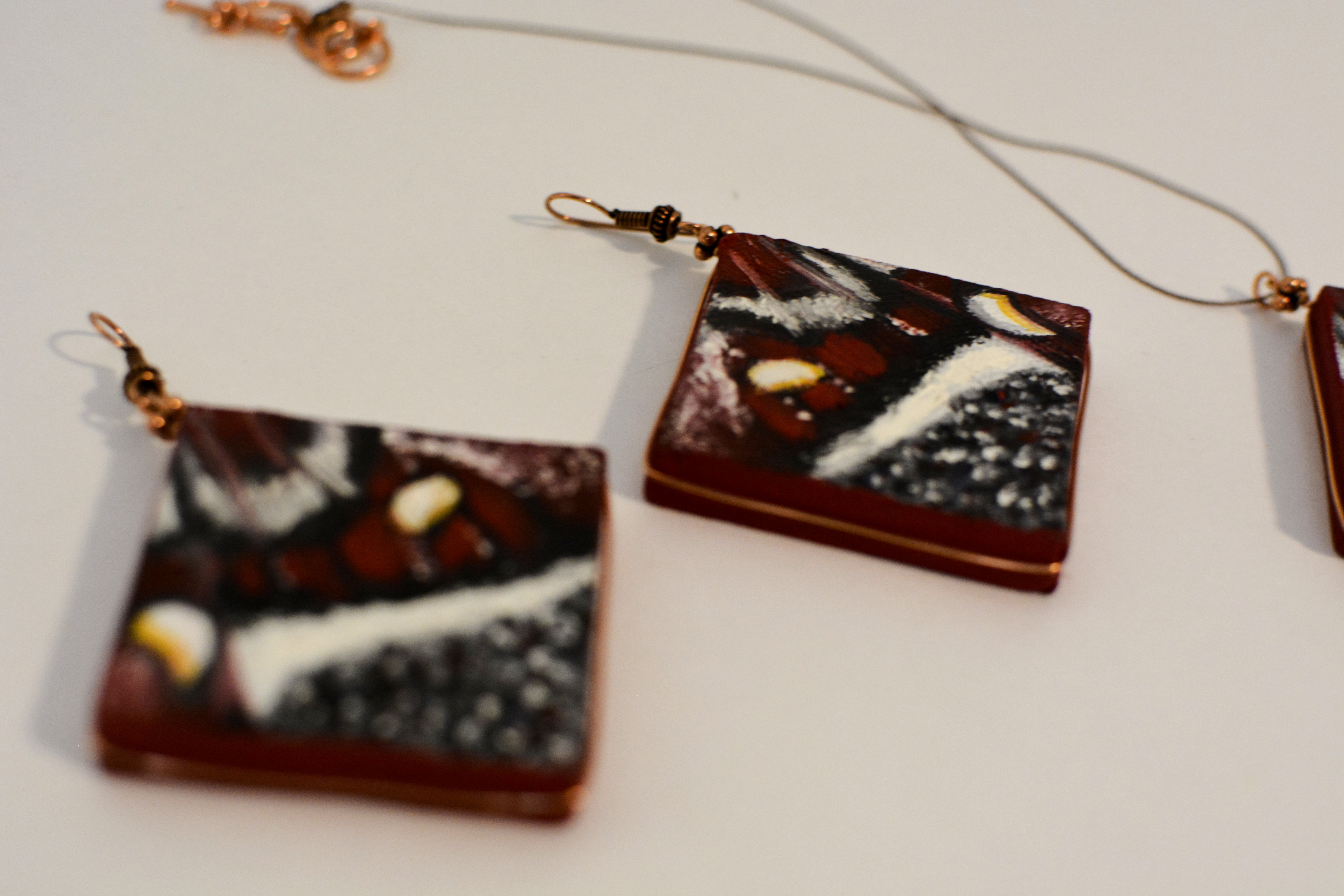 Jedenastym zestawem biżuterii malarskiej jaki prezentuje jest ,,Motyl XI”. W tym zestawie elementy metalowe wykonane są z miedzi. Dla pogłębienia kontrastu zastosowałam lustra.