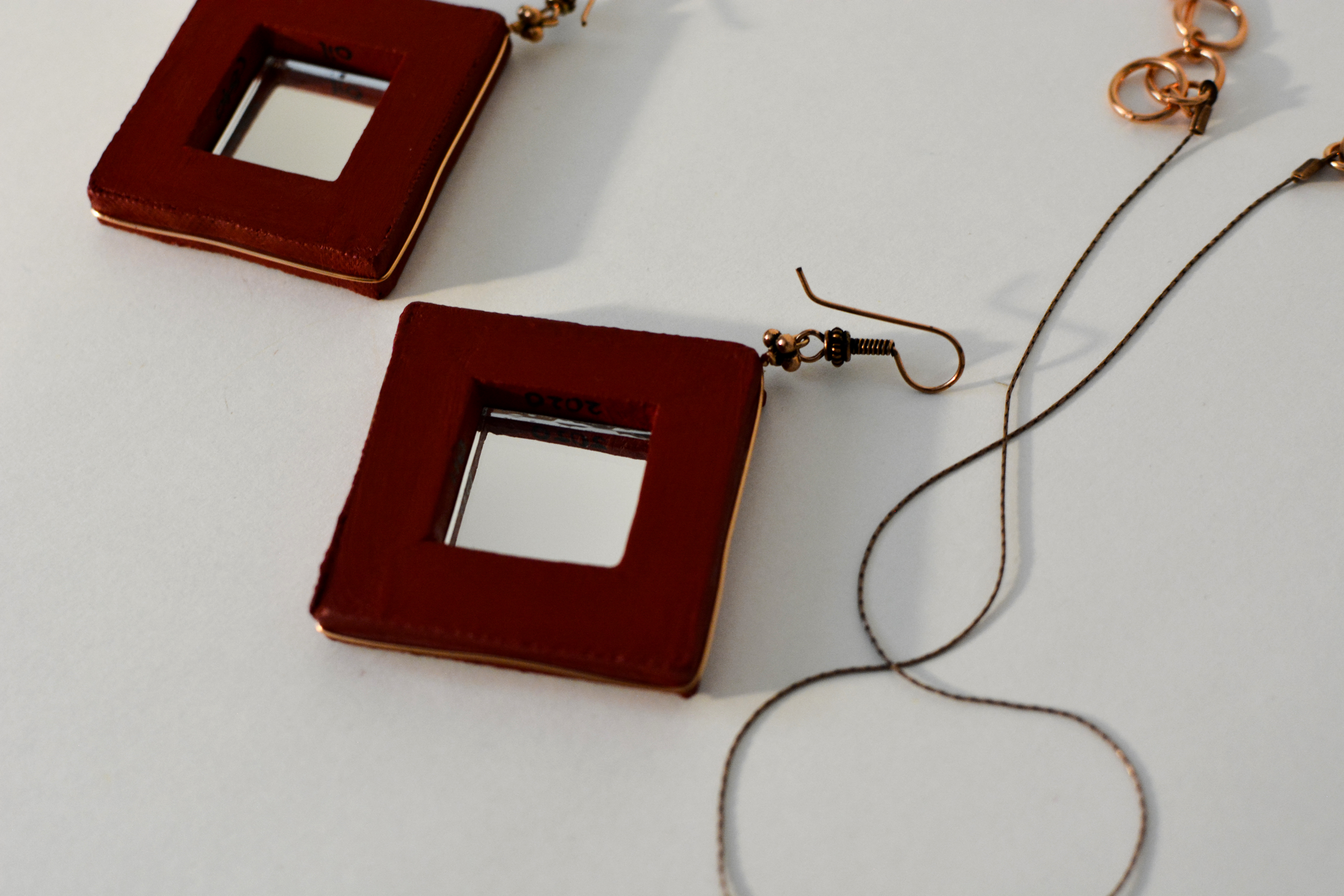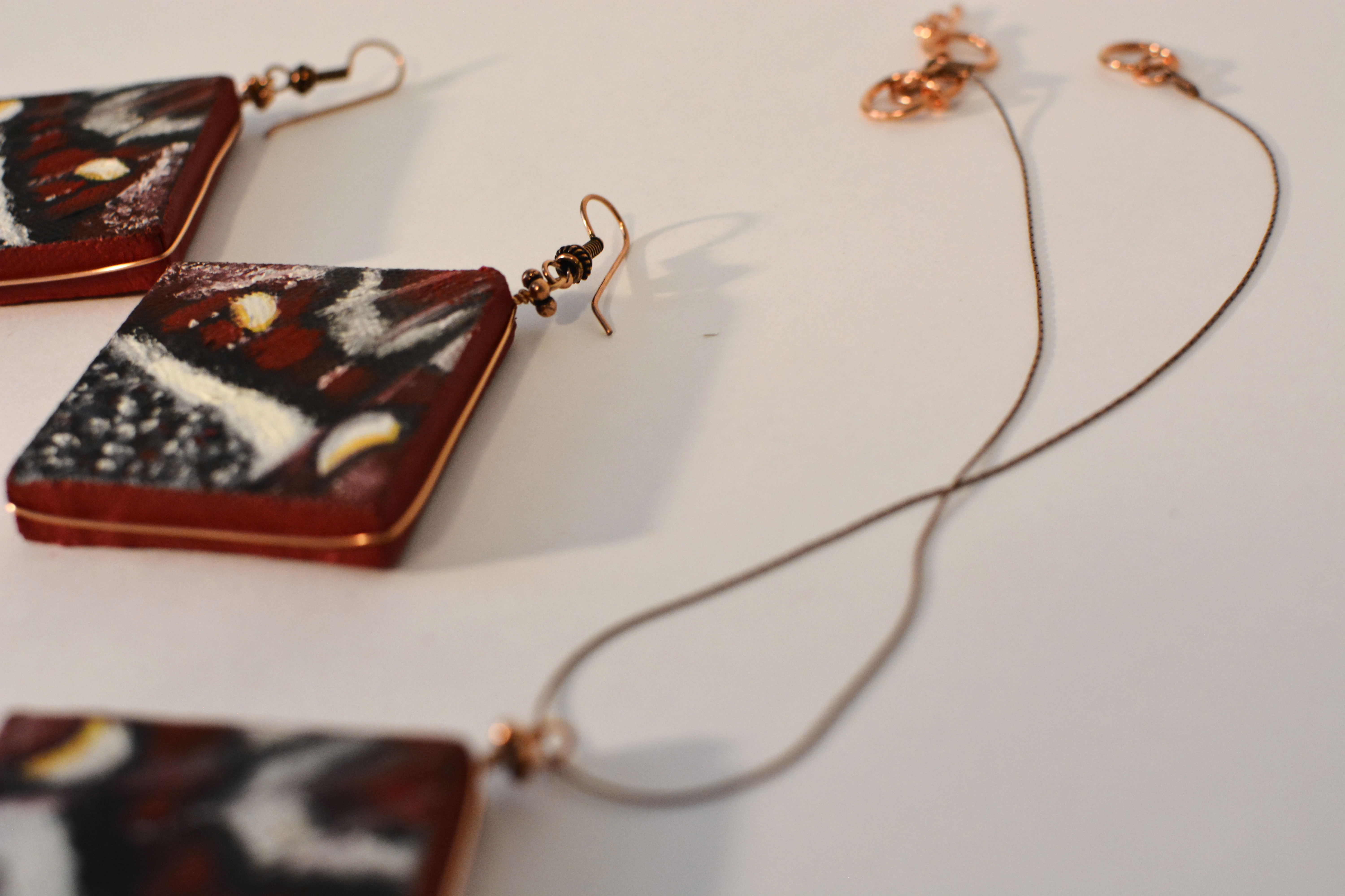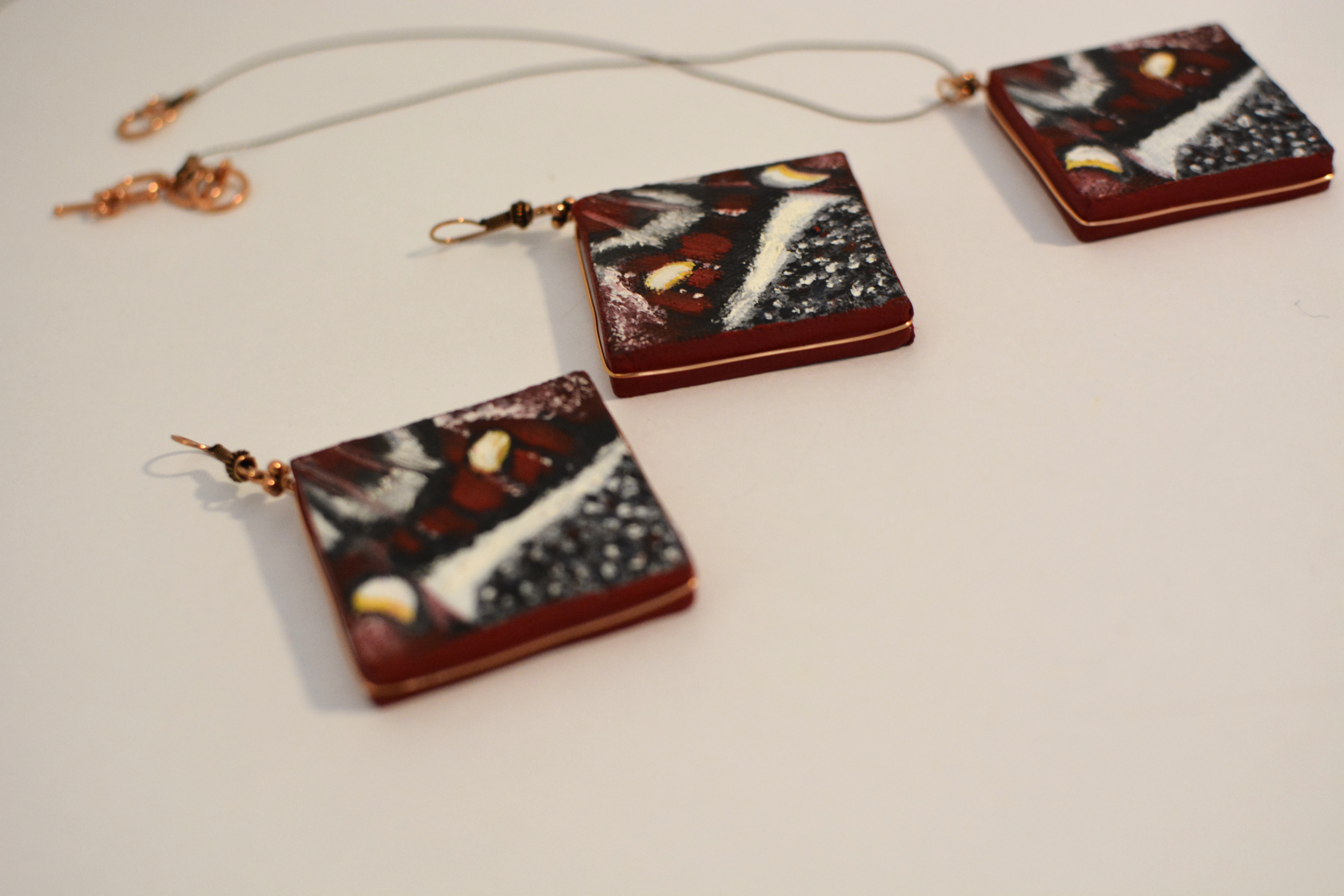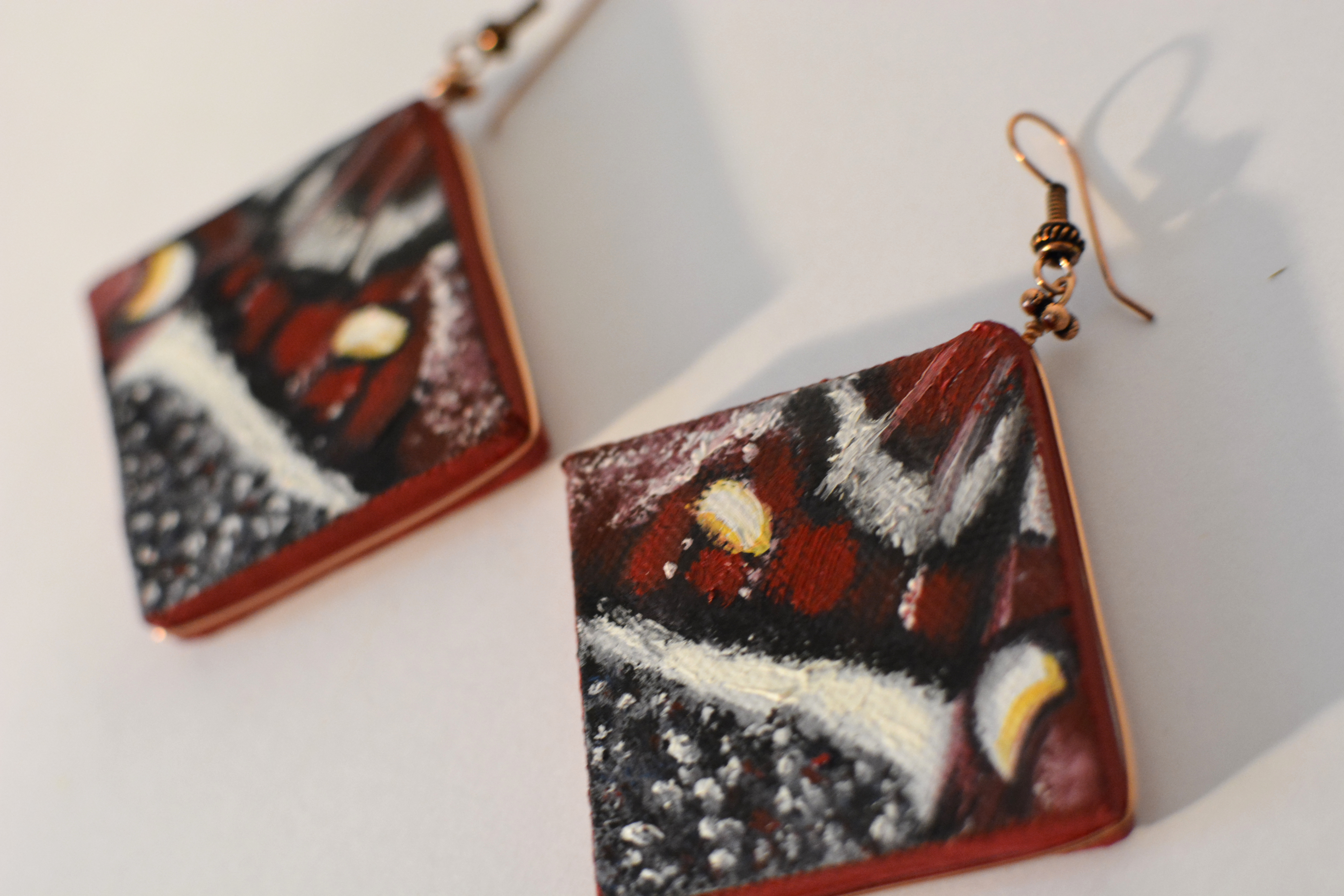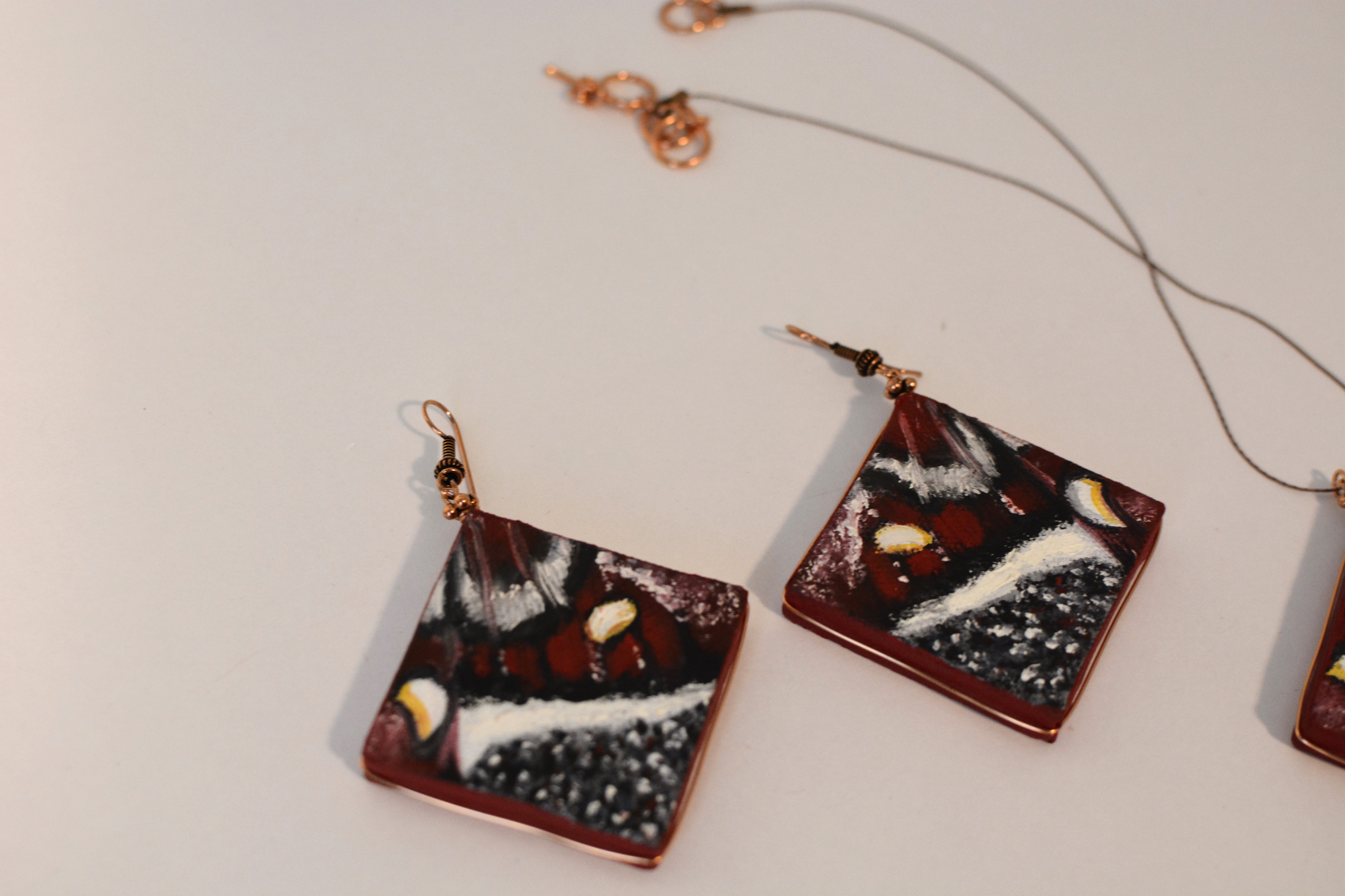 The eleventh set of the painting jewelry I present is “Butterfly XI.” The metal elements are made of copper in this set as well. To increase the contrast I have used mirrors.