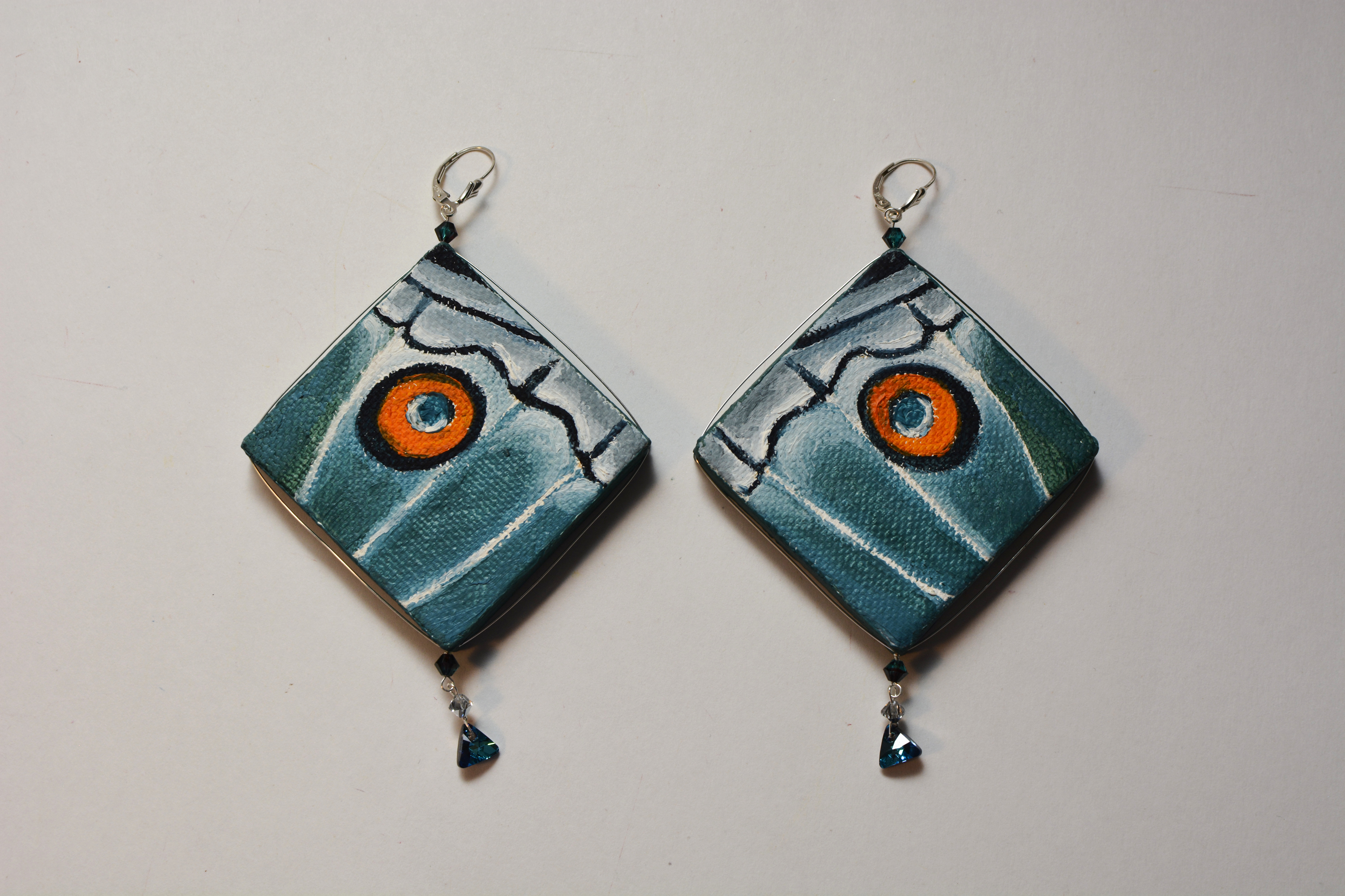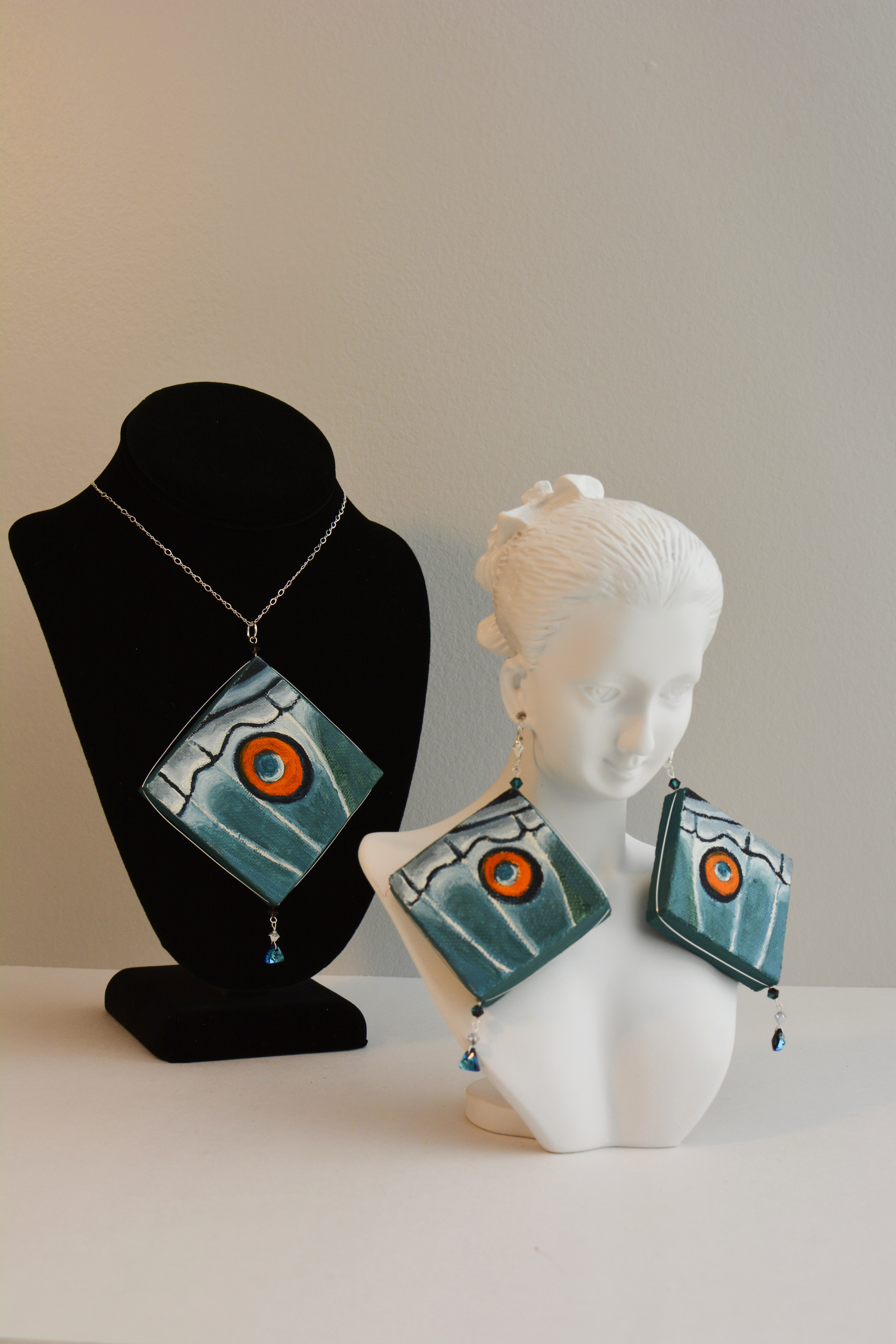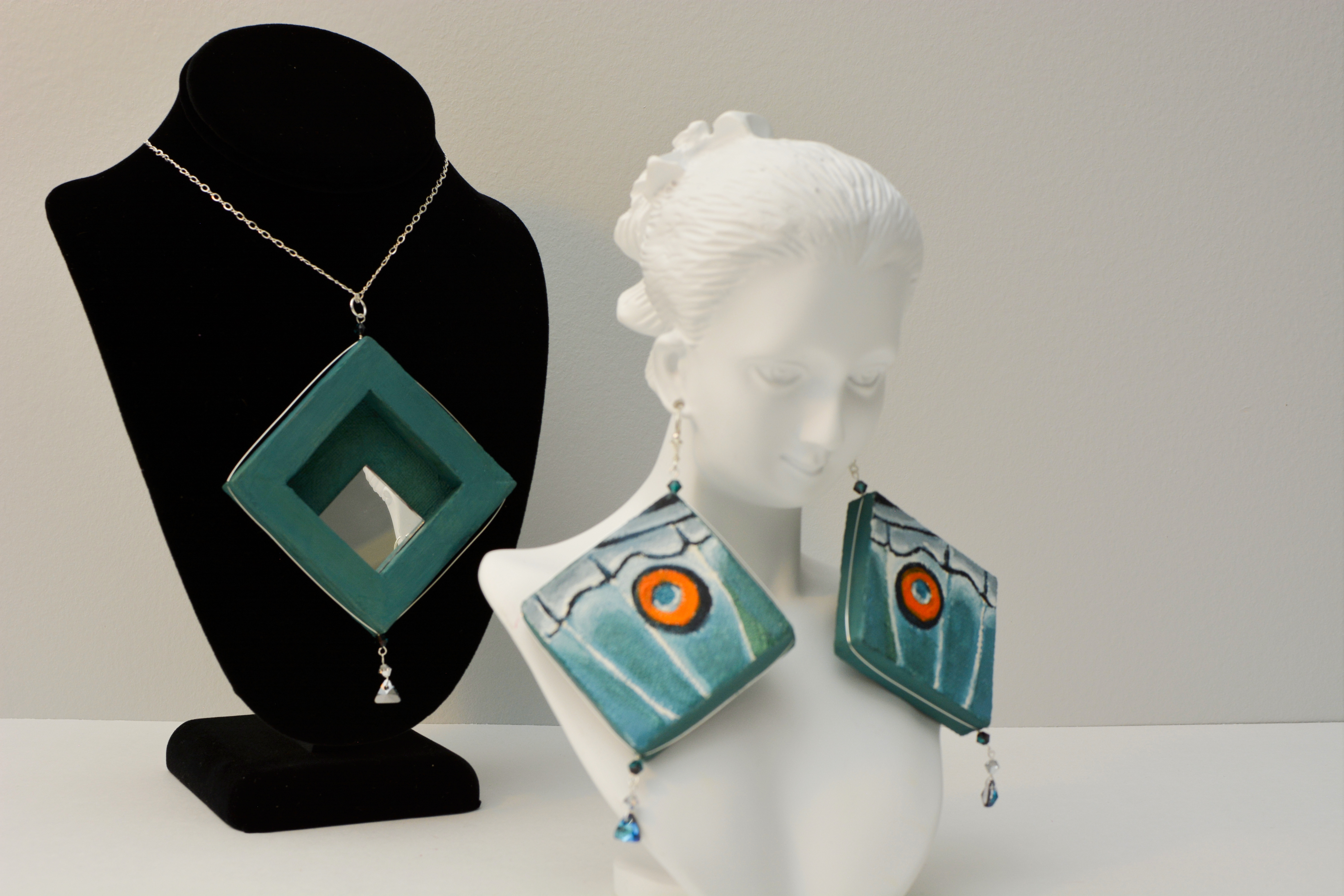 The fourteenth set of the painting jewelry I present is “Butterfly VII.” The metal elements are made of sterling silver in this set as well. To increase the contrast I have used mirrors.