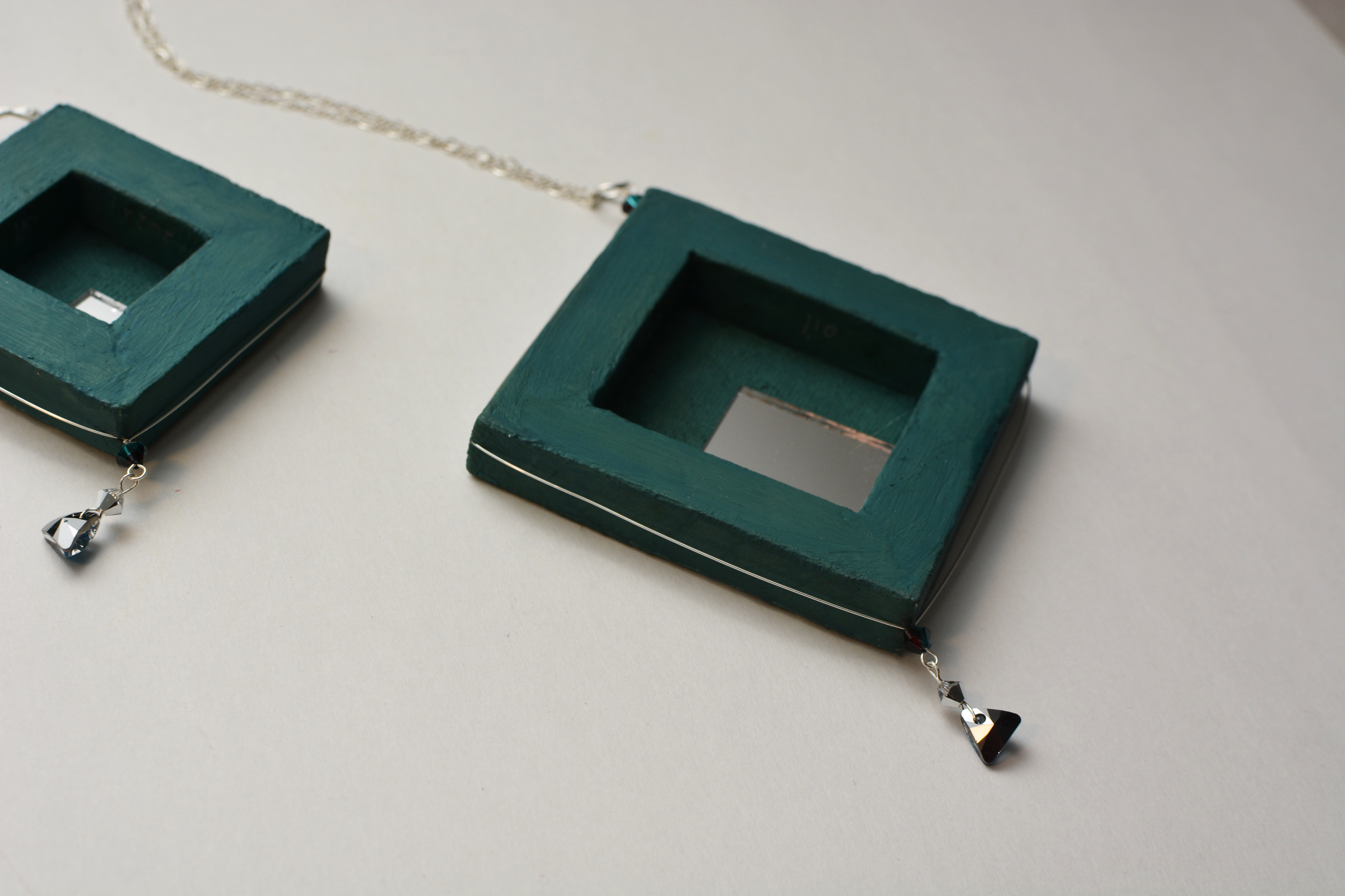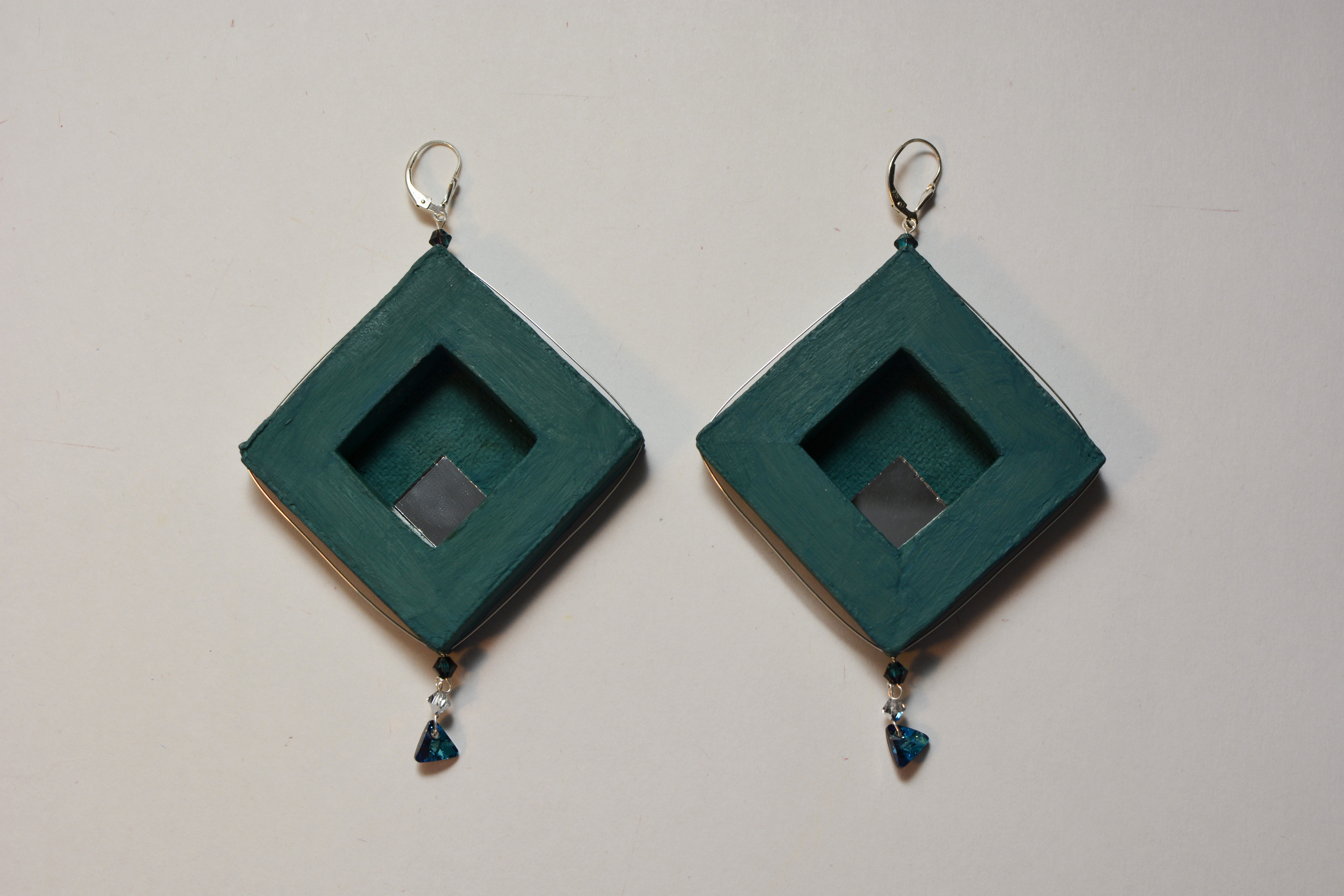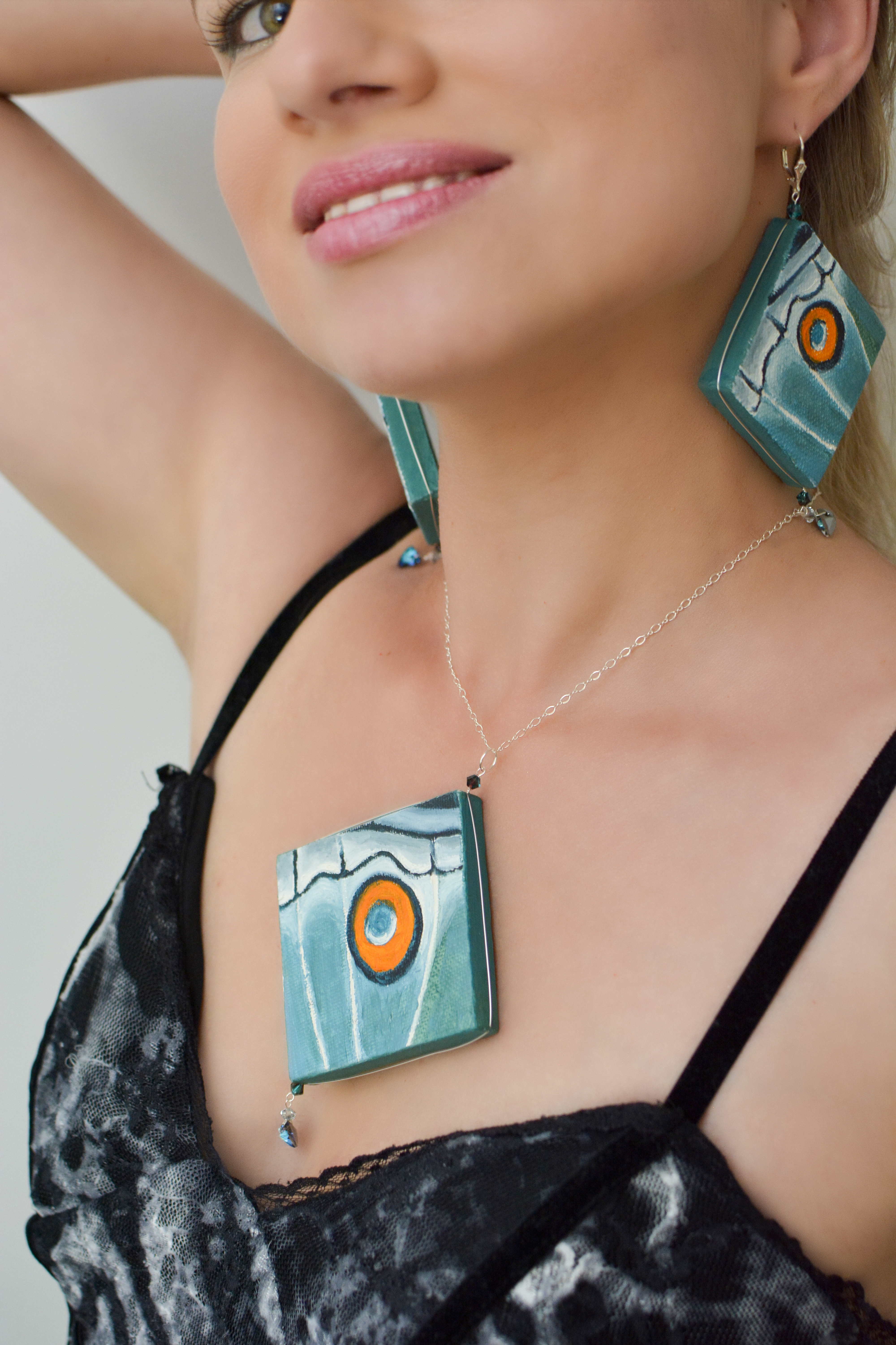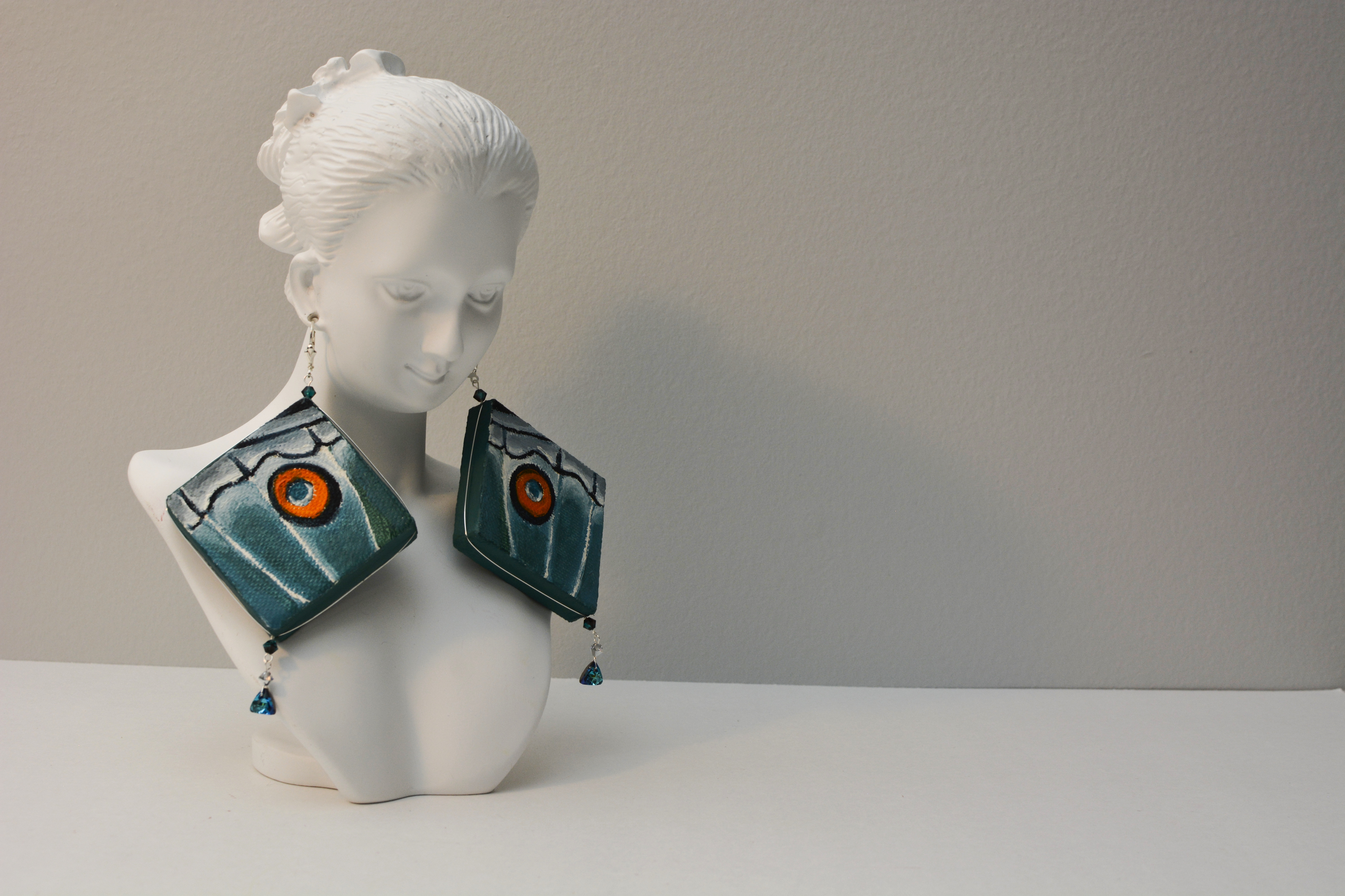 The fourteenth set of the painting jewelry I present is “Butterfly VII.” The metal elements are made of sterling silver in this set as well. To increase the contrast I have used mirrors.