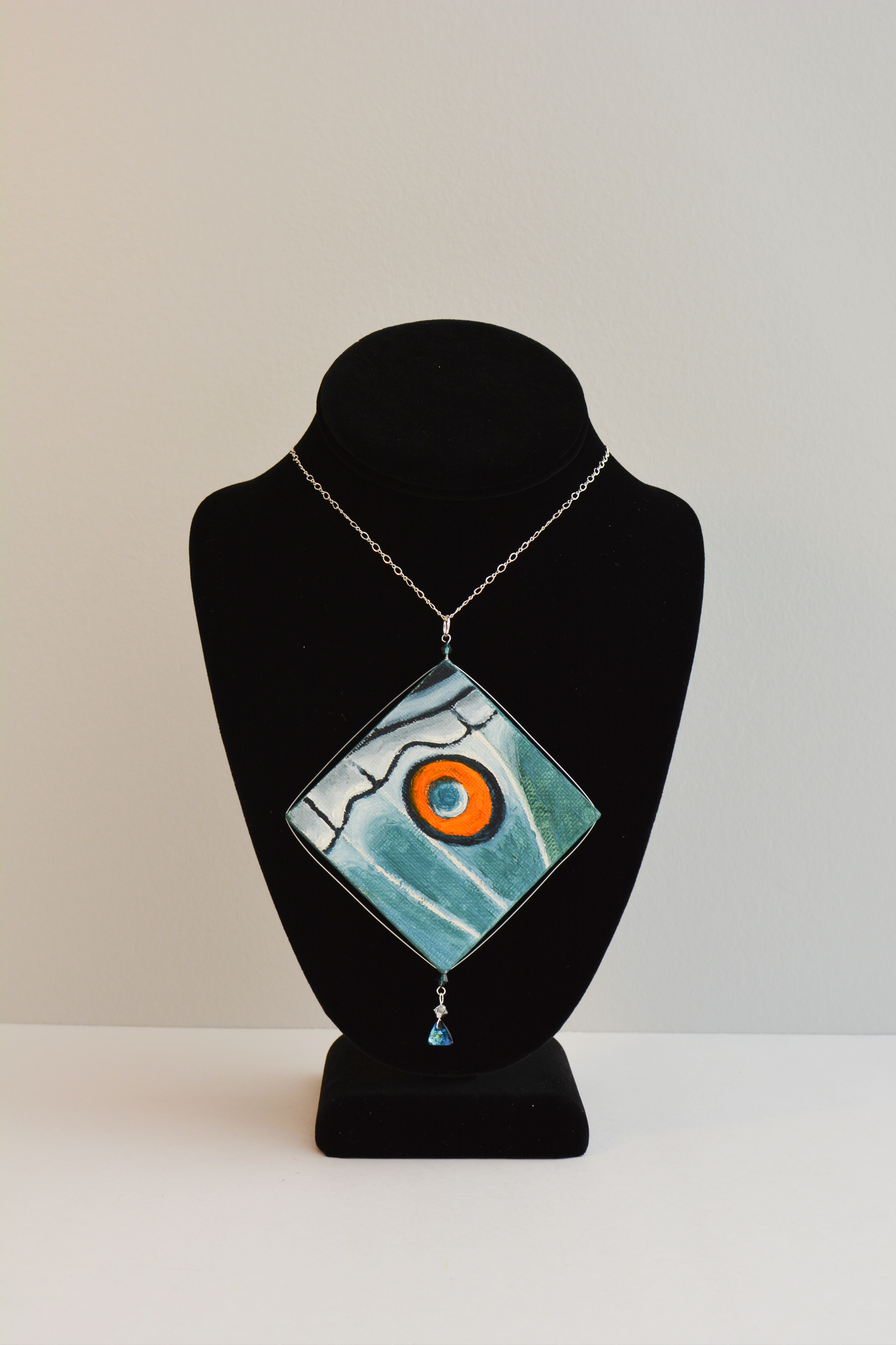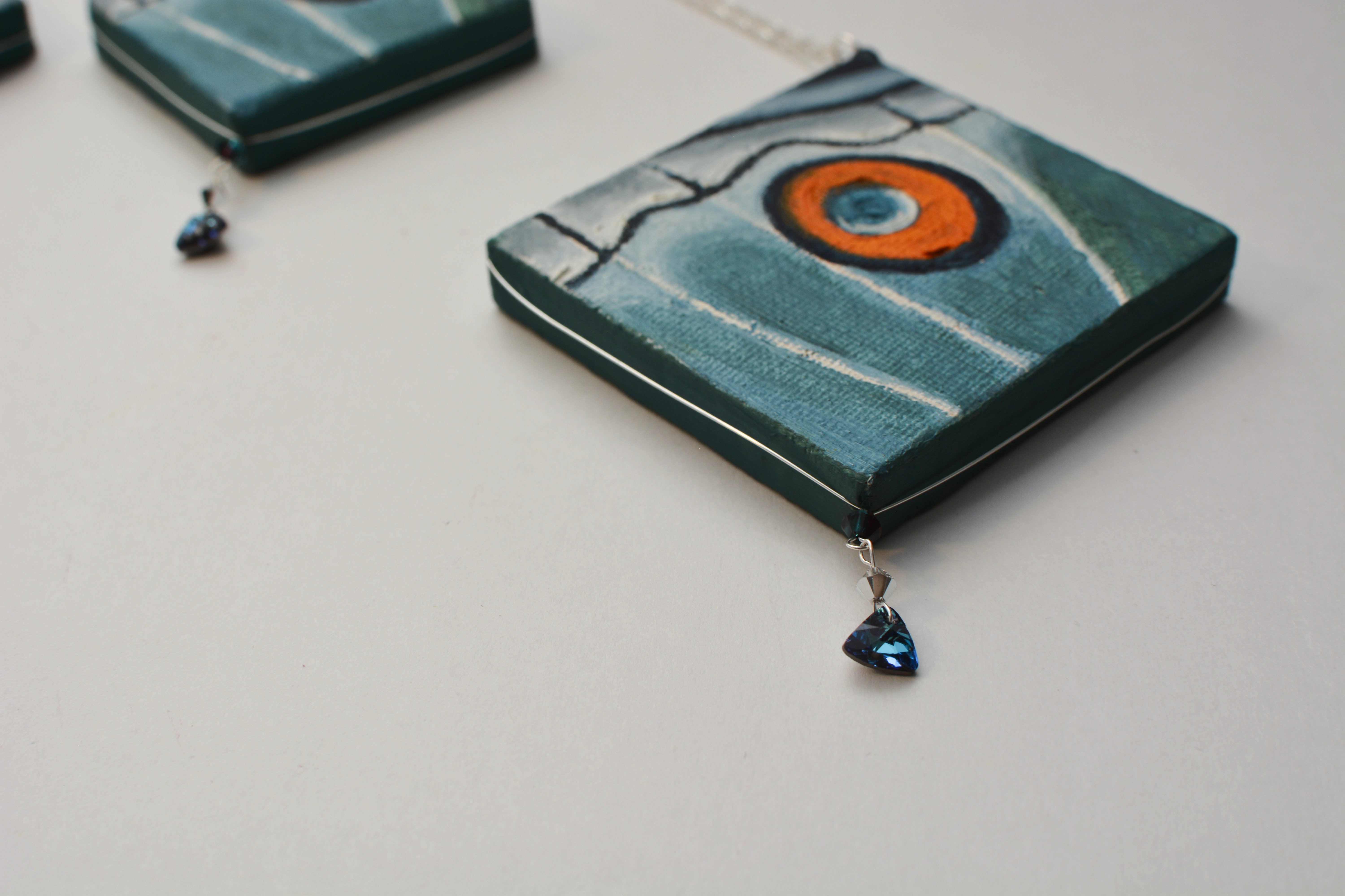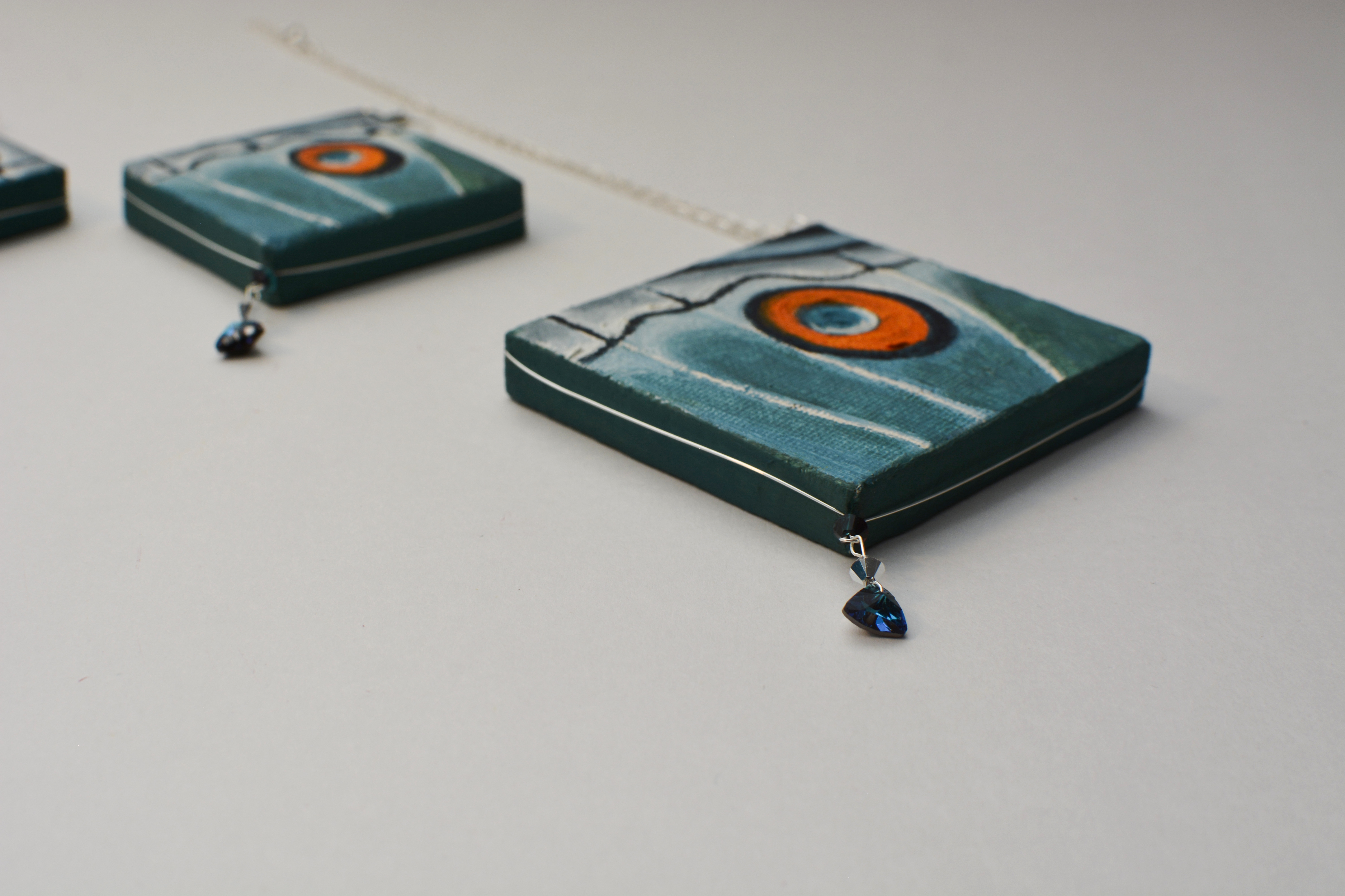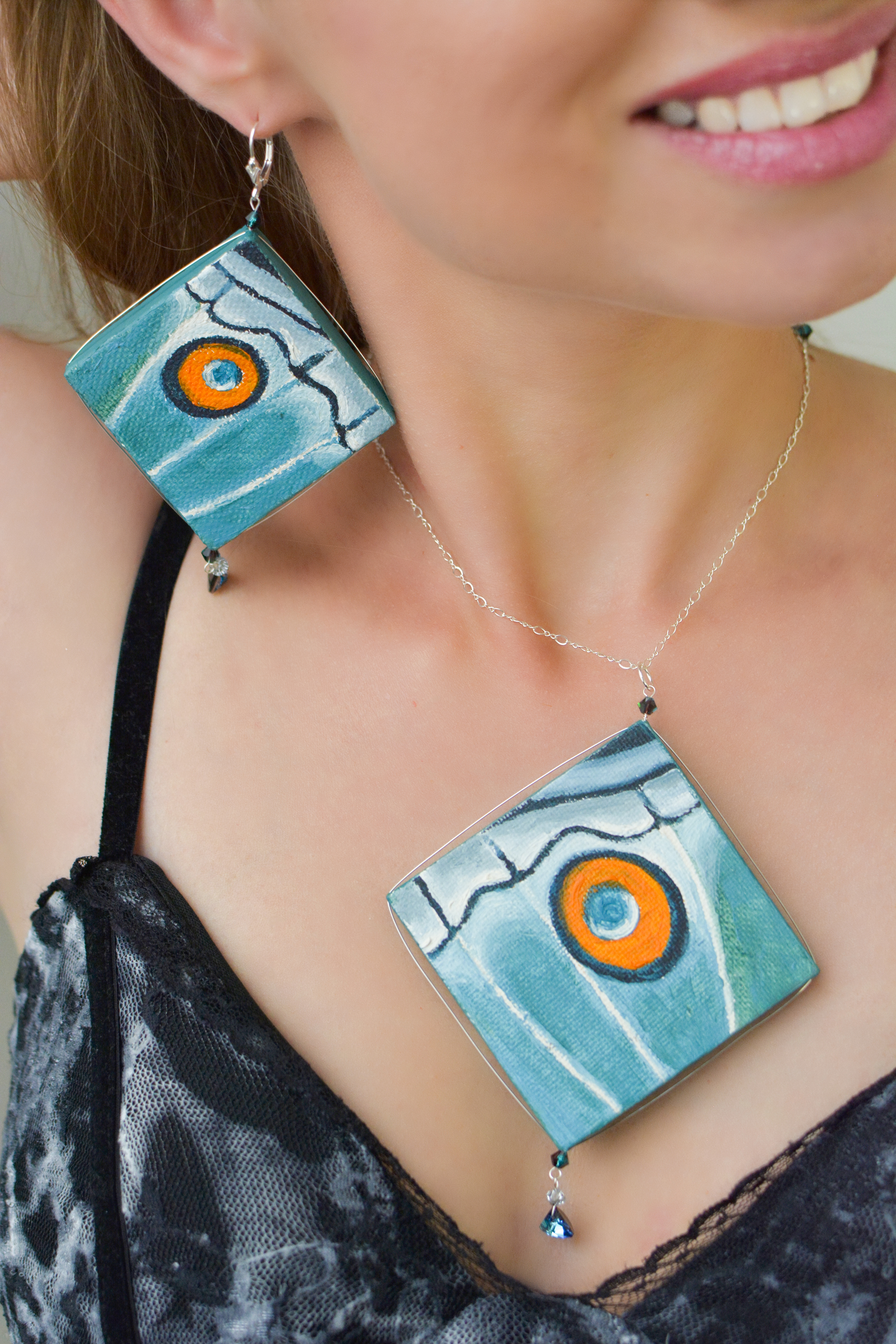 Czternastym zestawem biżuterii malarskiej jaki prezentuje jest ,,Motyl VII”. W tym zestawie elementy metalowe wykonane są ze srebra. Dla pogłębienia kontrastu zastosowałam lustra.
