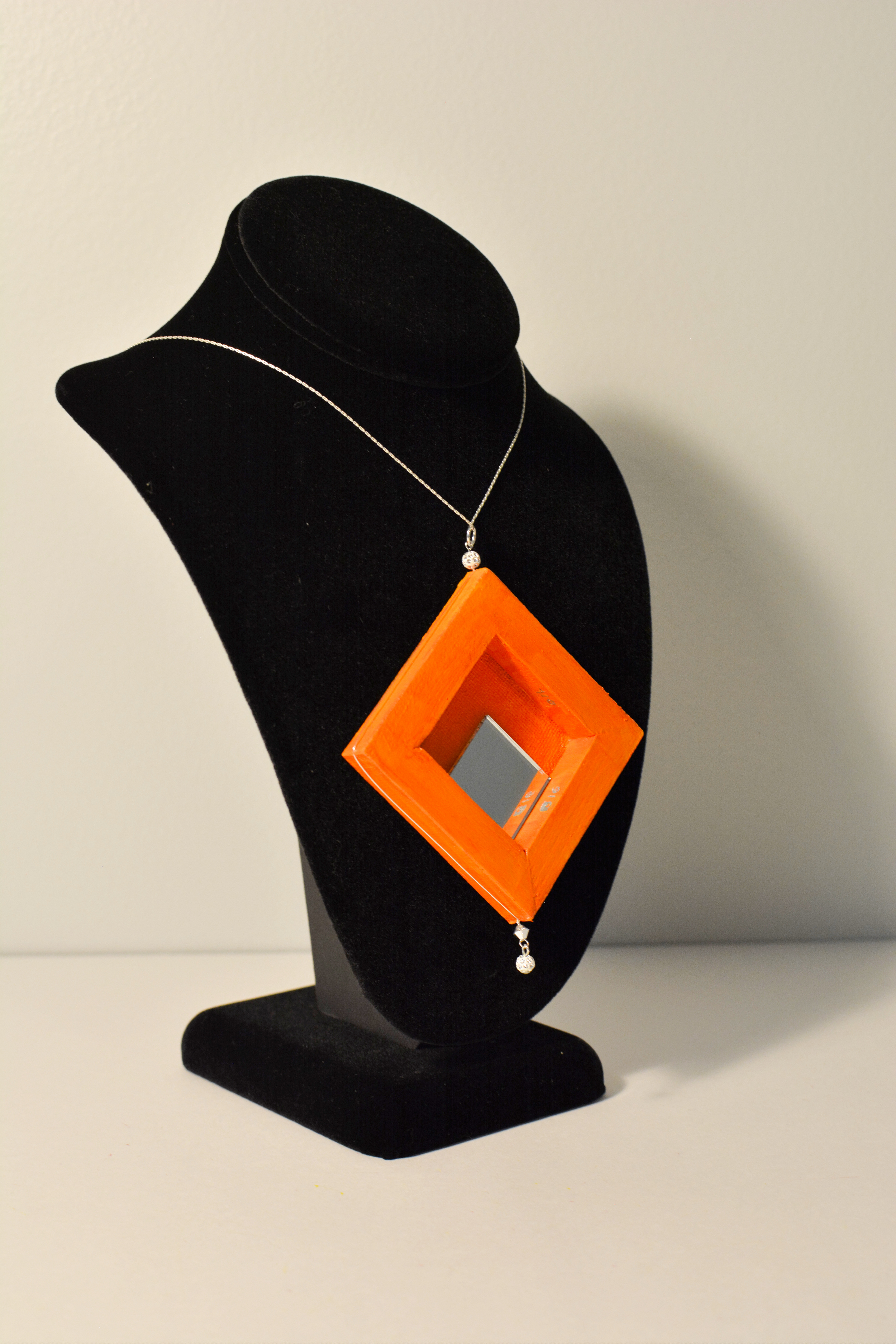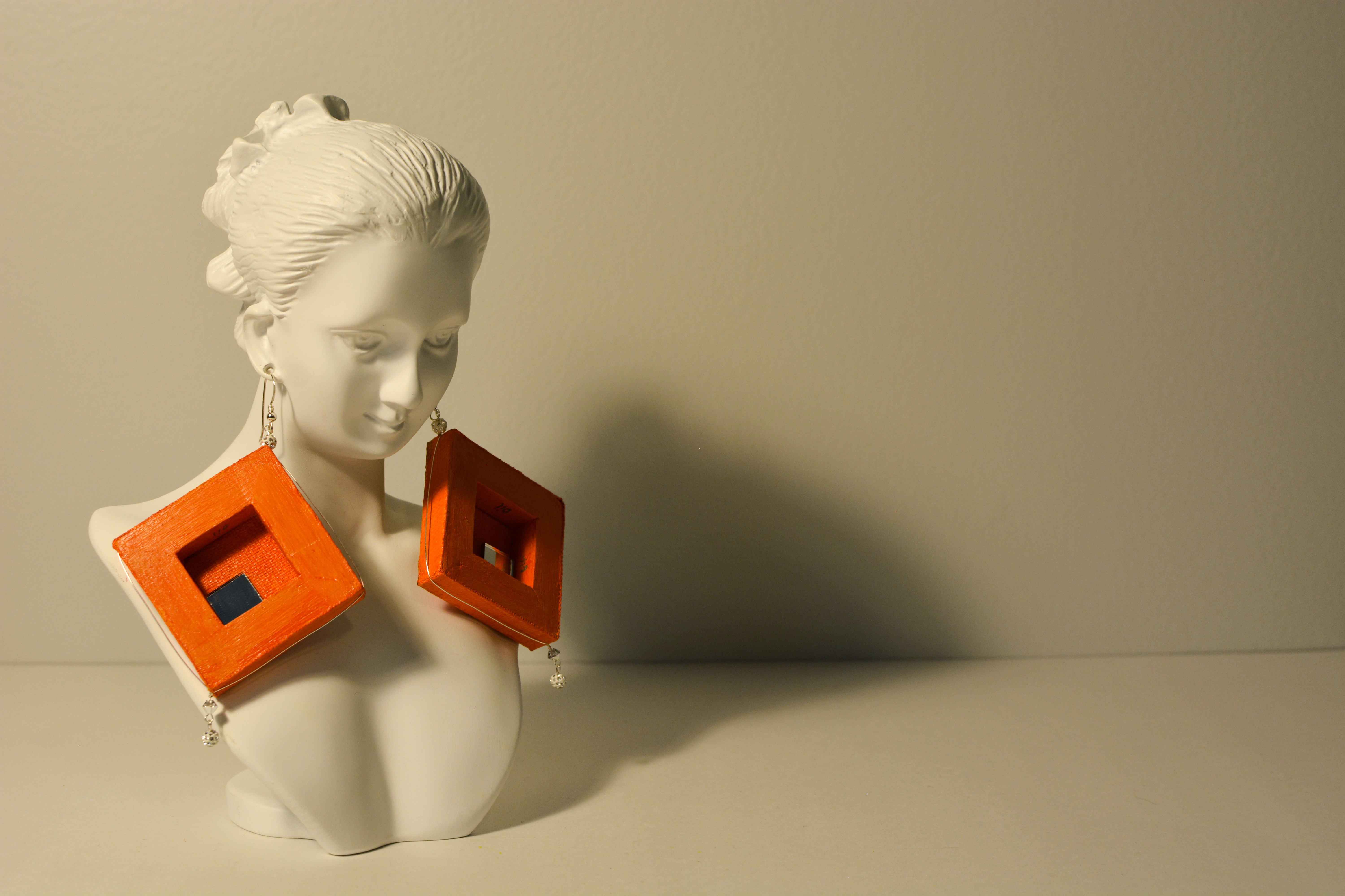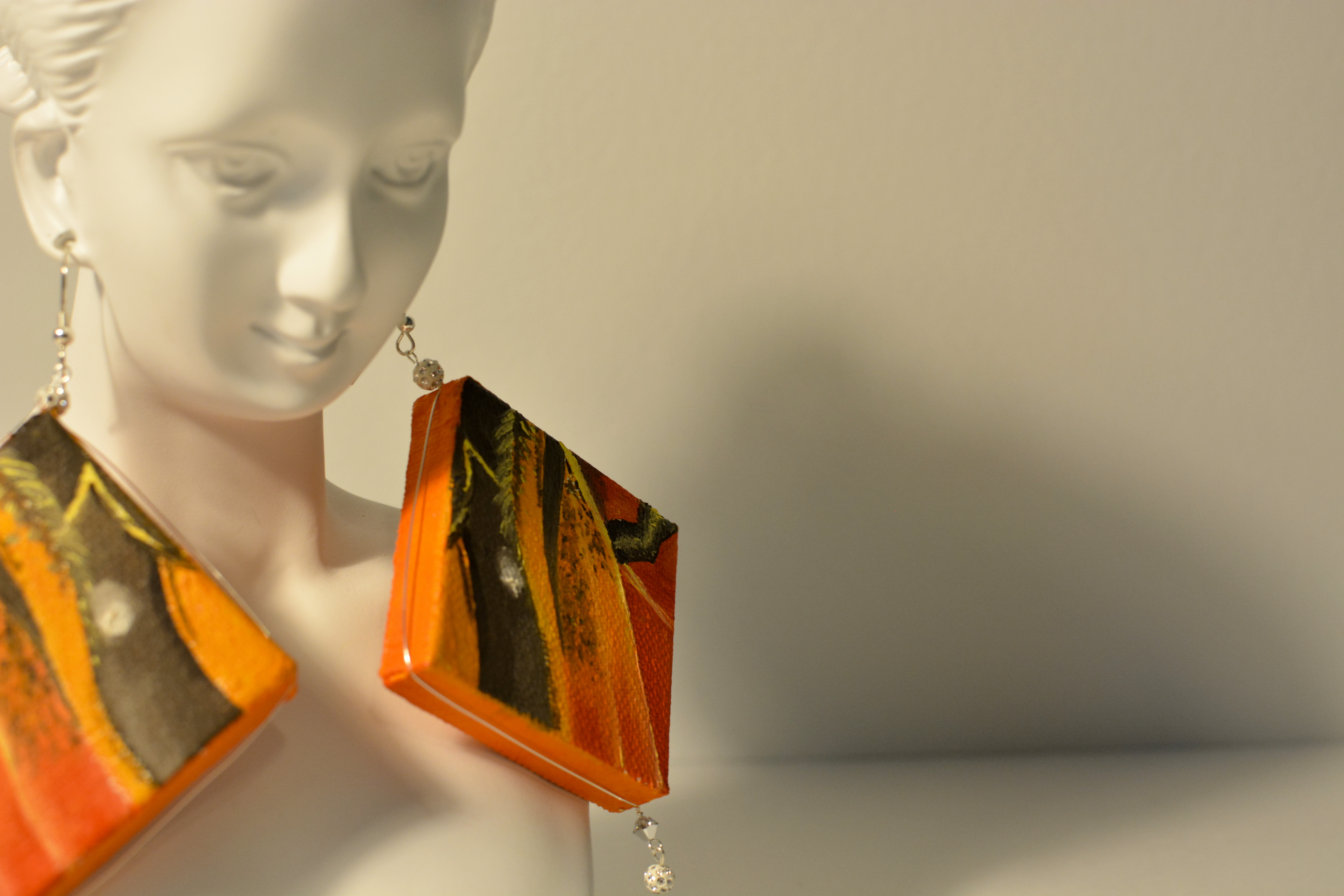 Siedemnastym zestawem biżuterii malarskiej jaki prezentuje jest ,,Motyl XVI”. W tym zestawie elementy metalowe wykonane są ze srebra. Dla pogłębienia kontrastu zastosowałam lustra.
