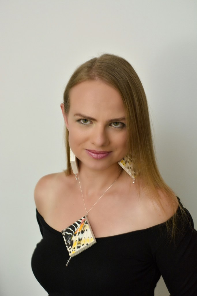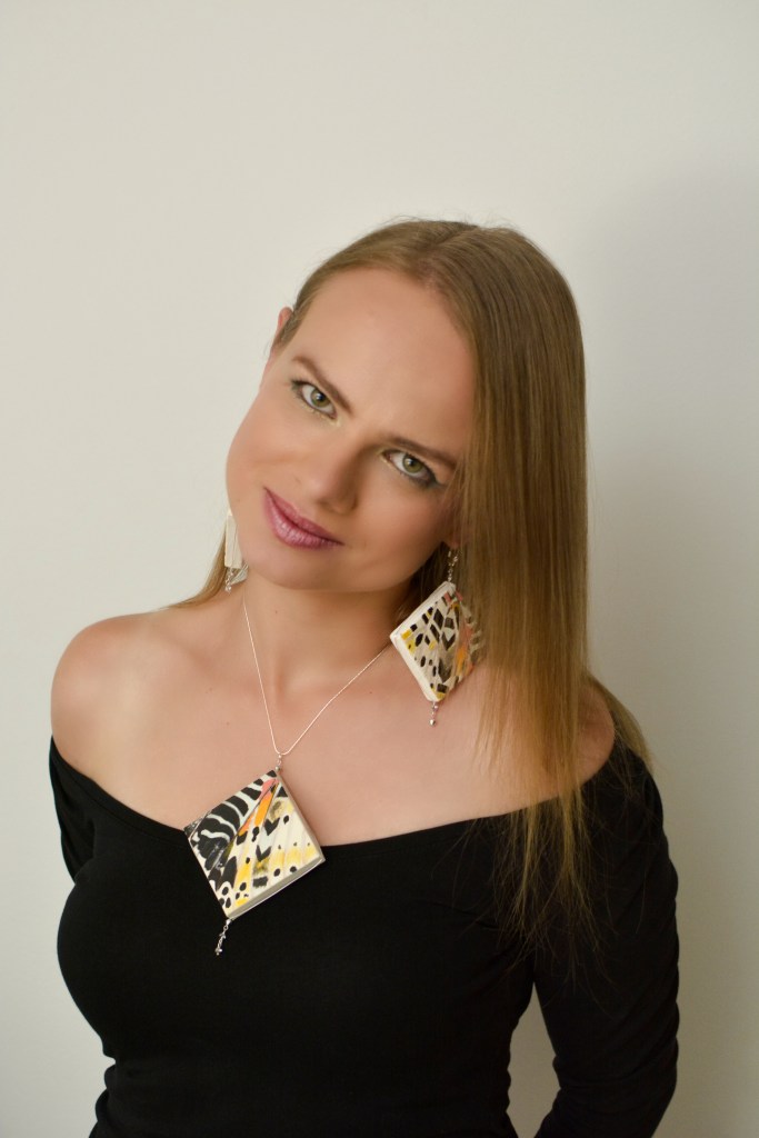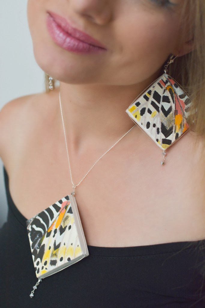 Dwudziestym zestawem biżuterii malarskiej jaki prezentuje jest ,,Motyl XIX”. W tym zestawie elementy metalowe wykonane są ze srebra. Dla pogłębienia kontrastu zastosowałam lustra.
