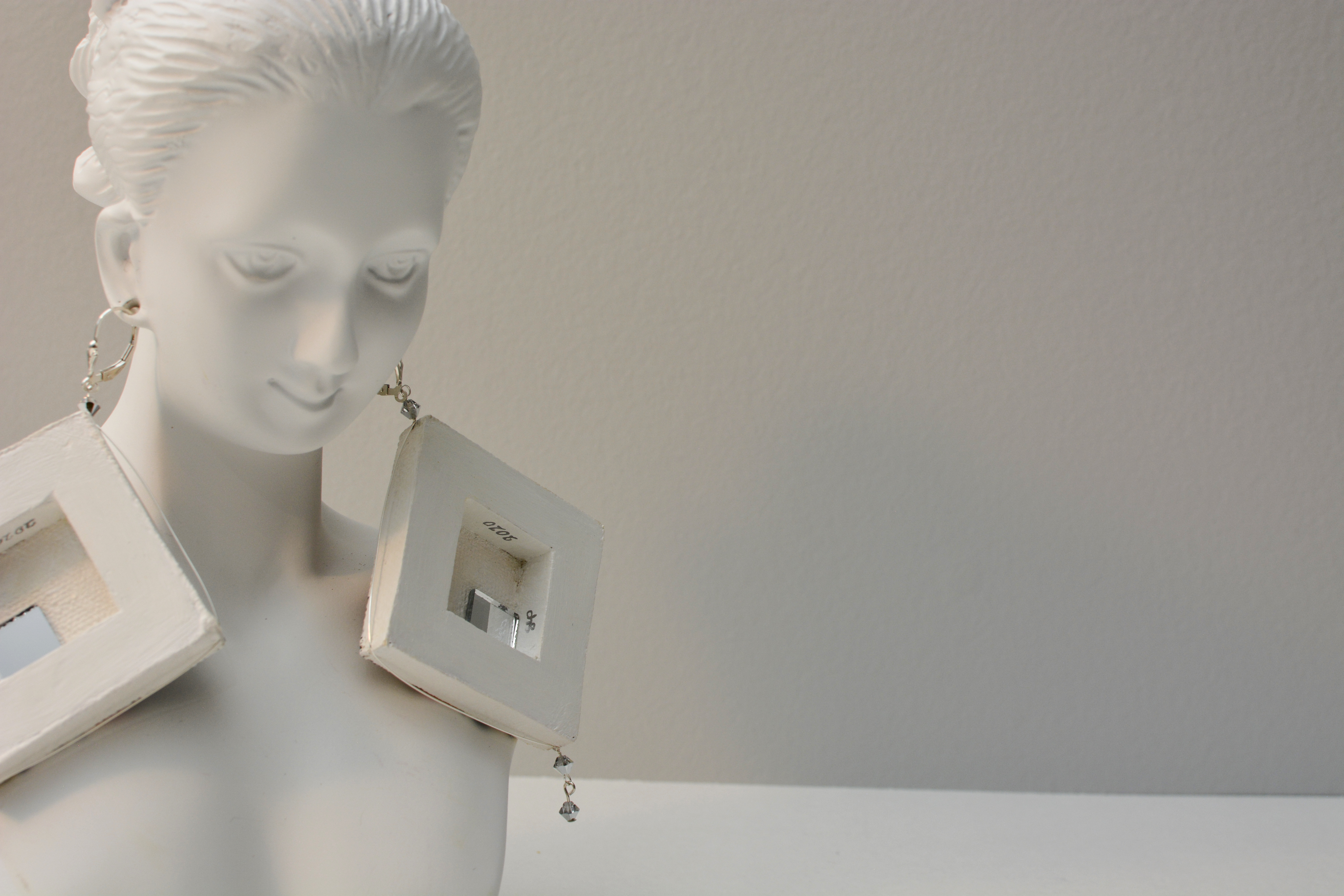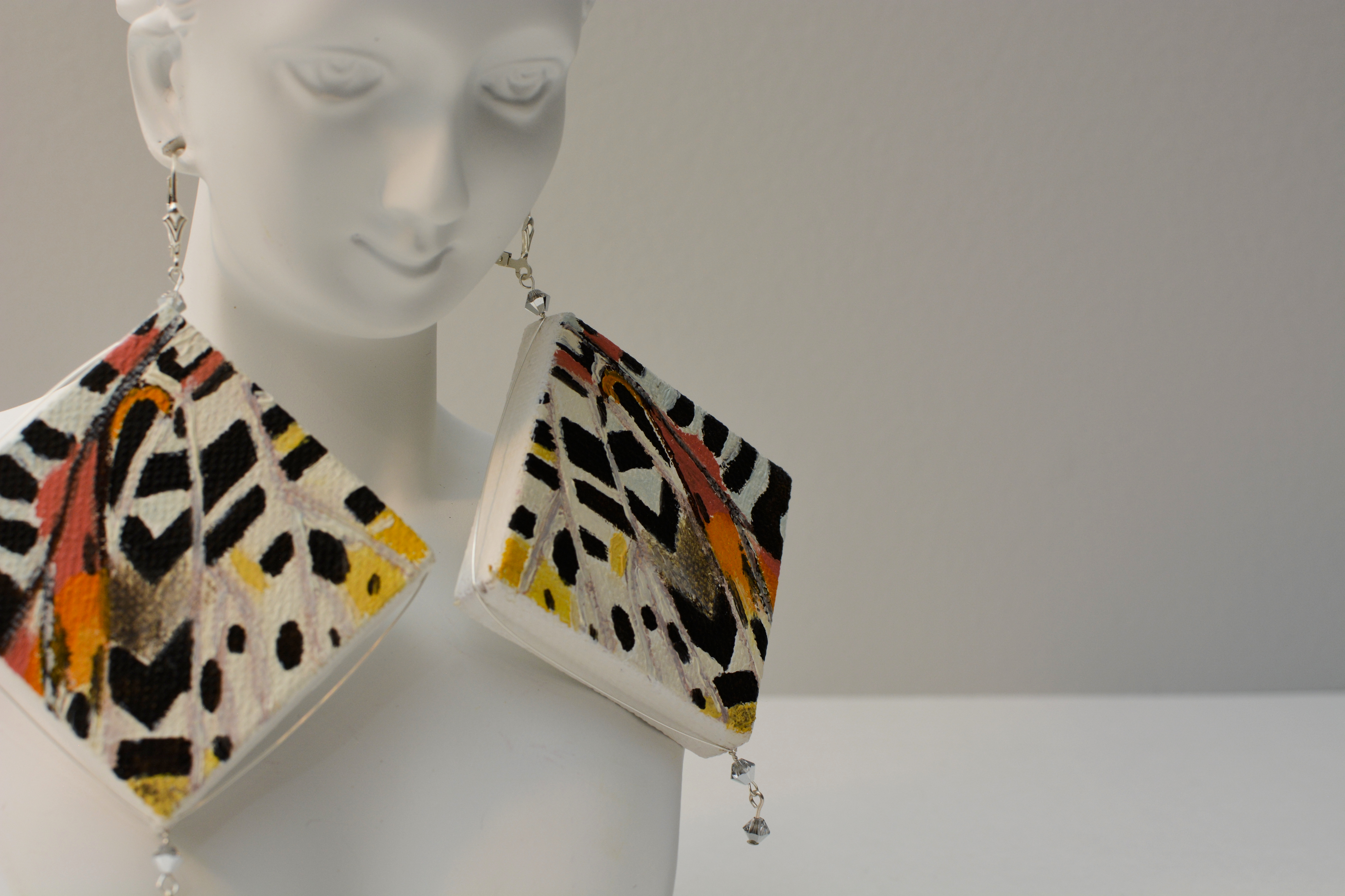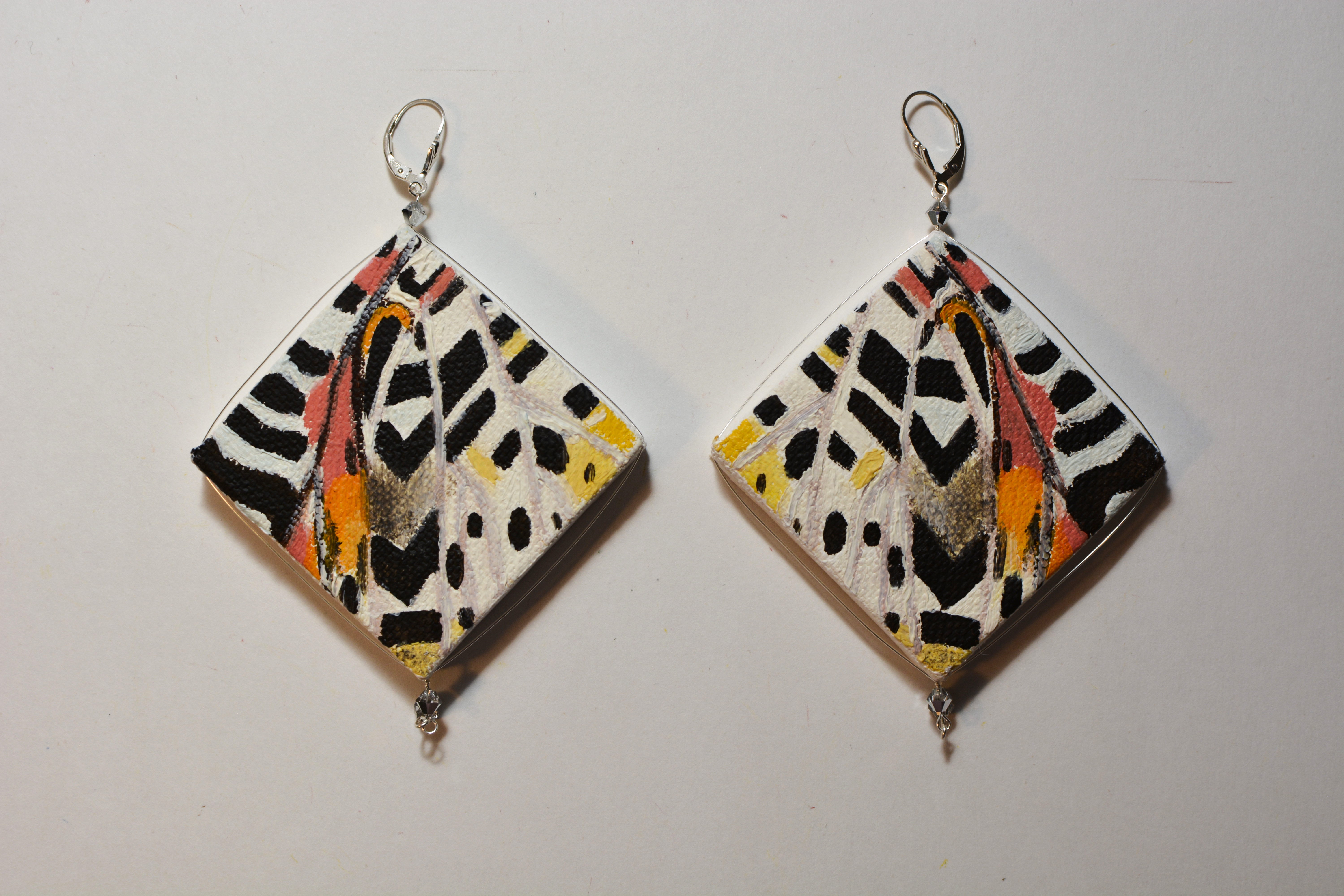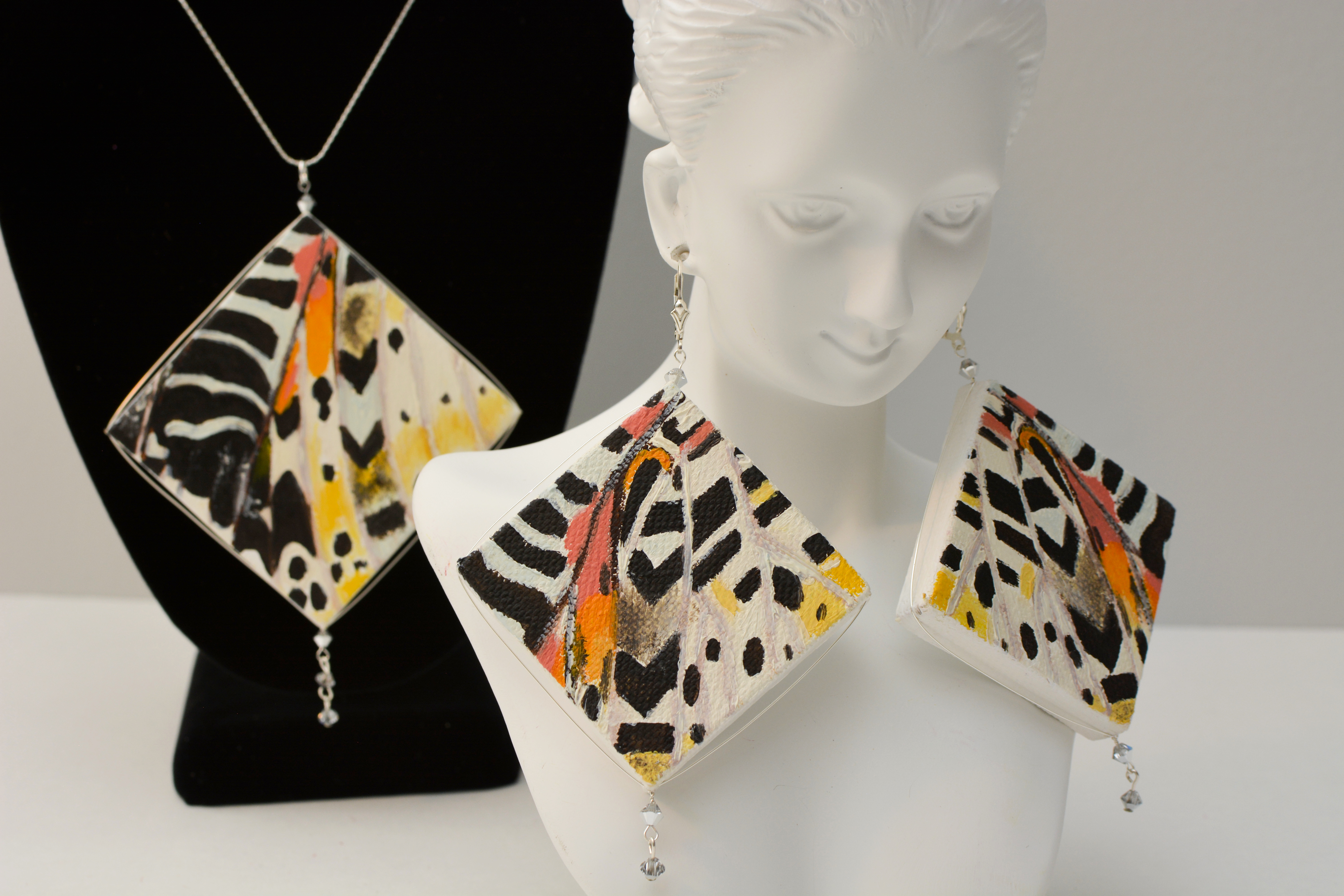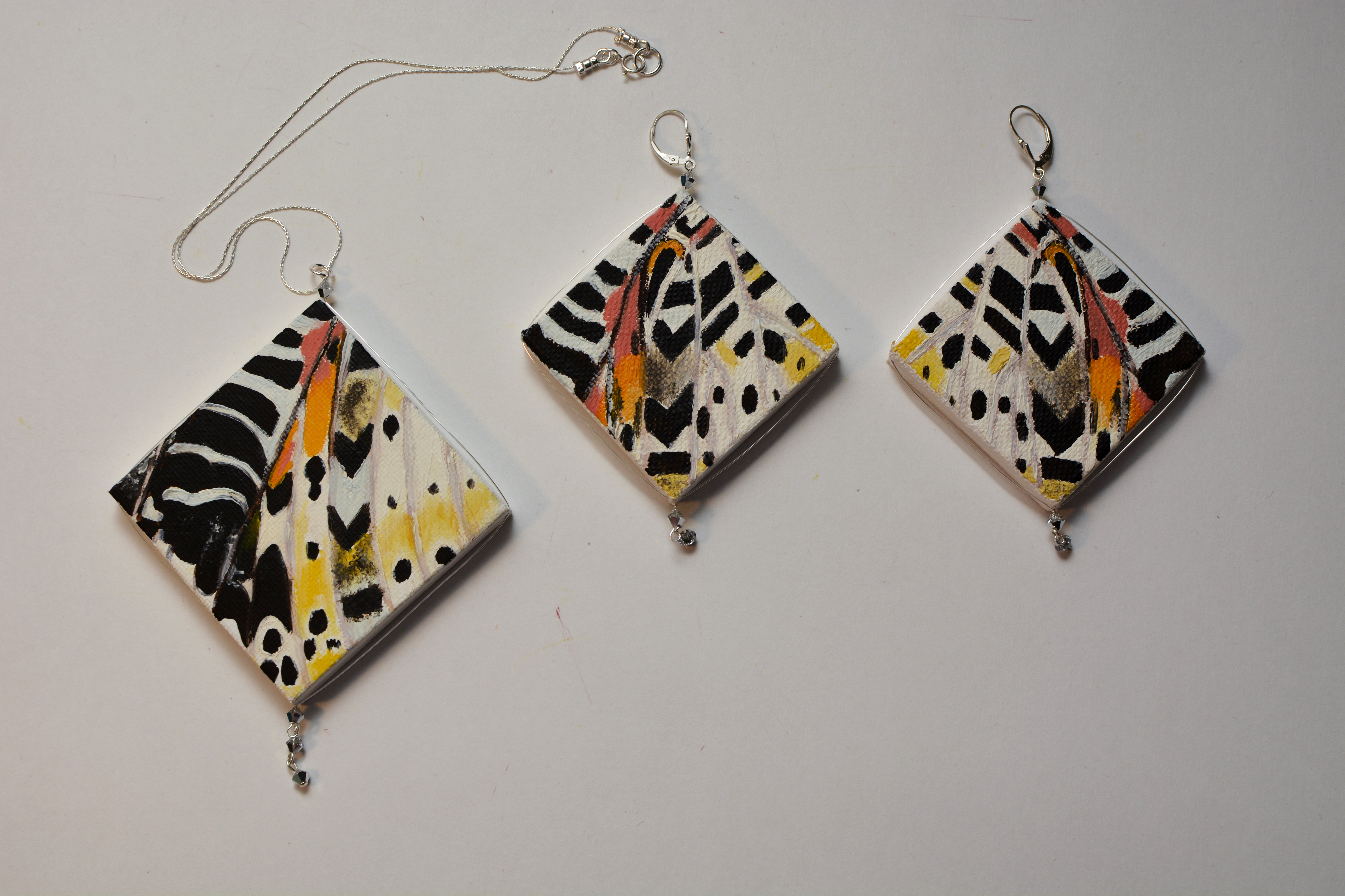 The the twentieth set of the painting jewelry I present is “Butterfly XIX.” The metal elements are made of sterling silver in this set as well. To increase the contrast I have used mirrors.