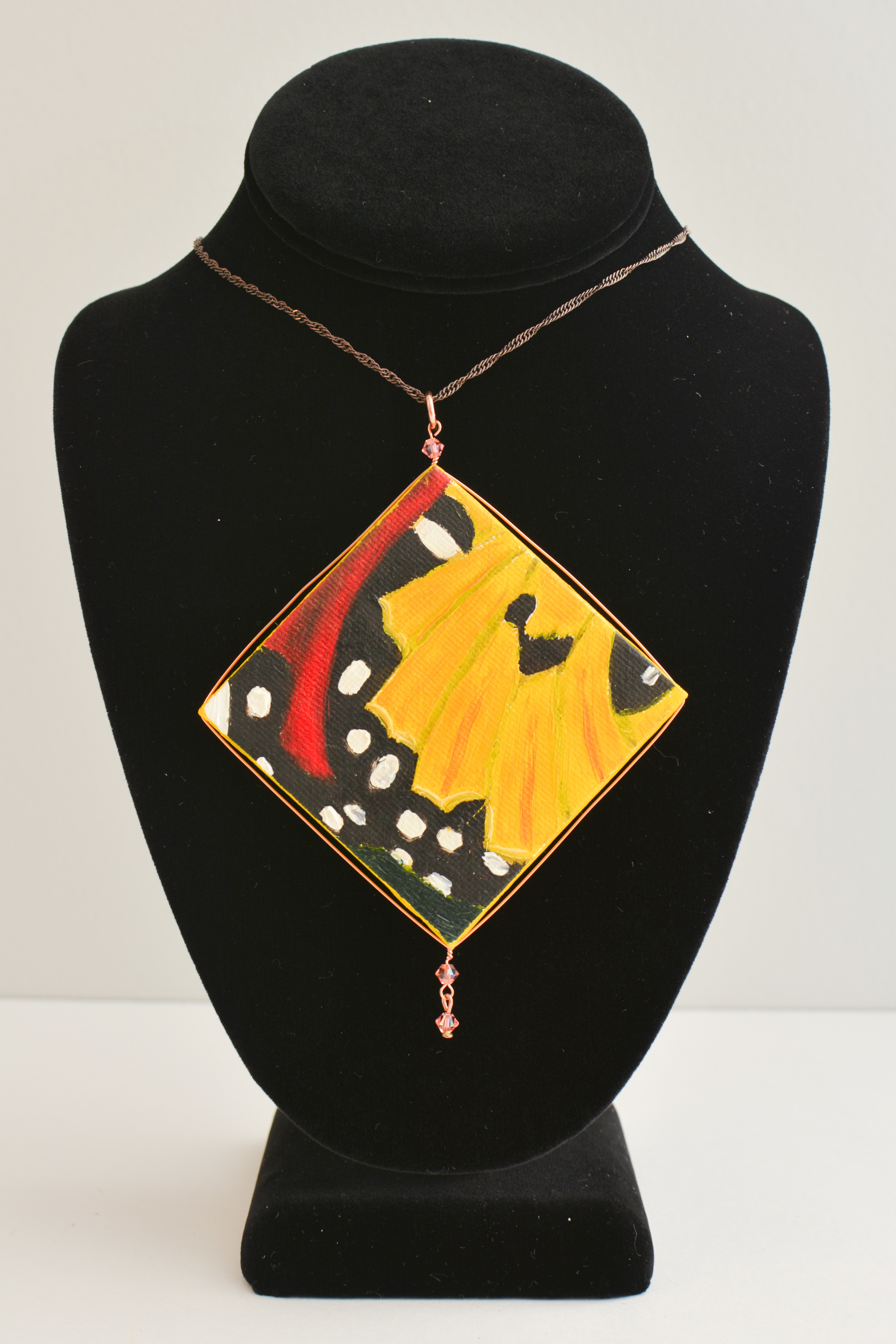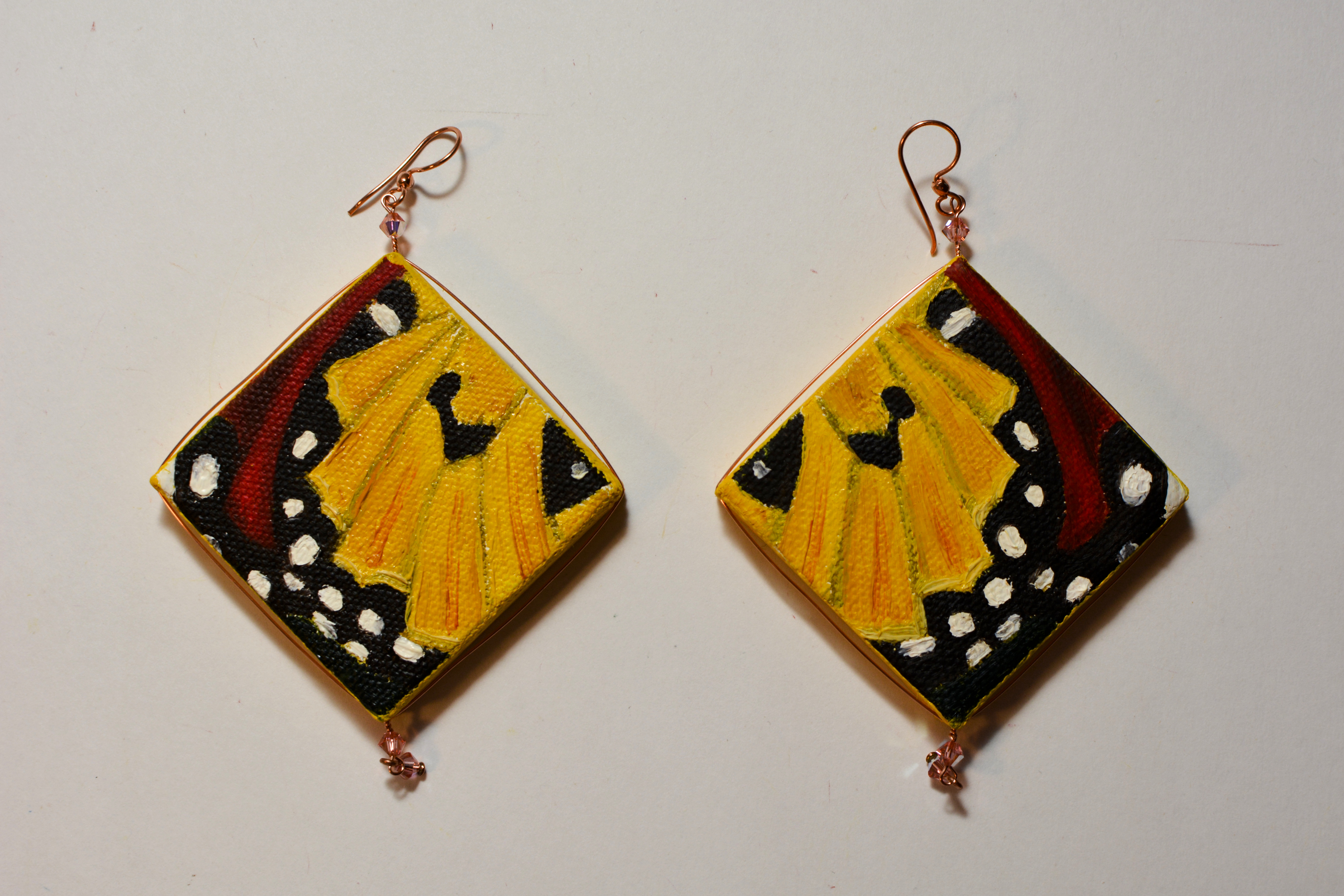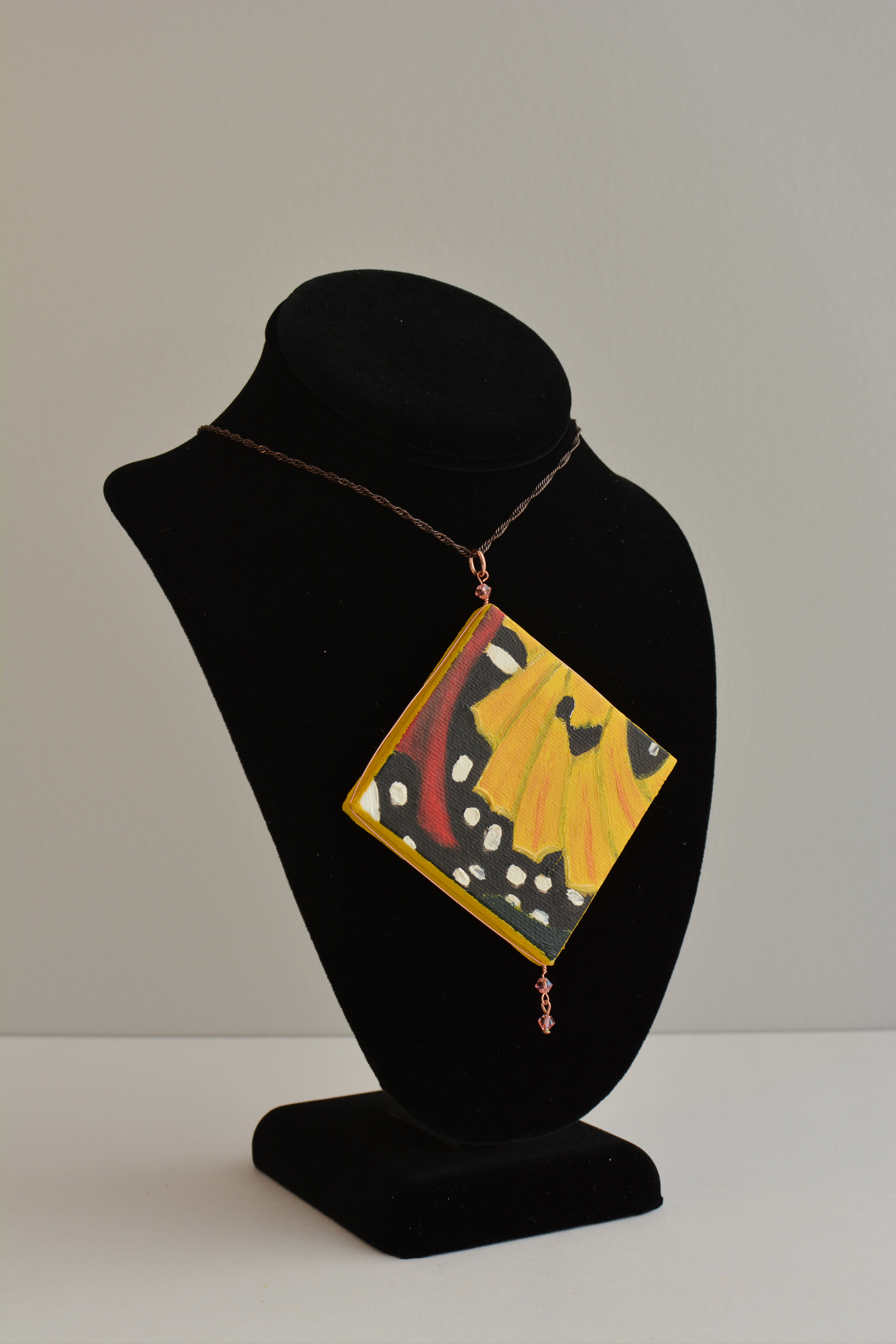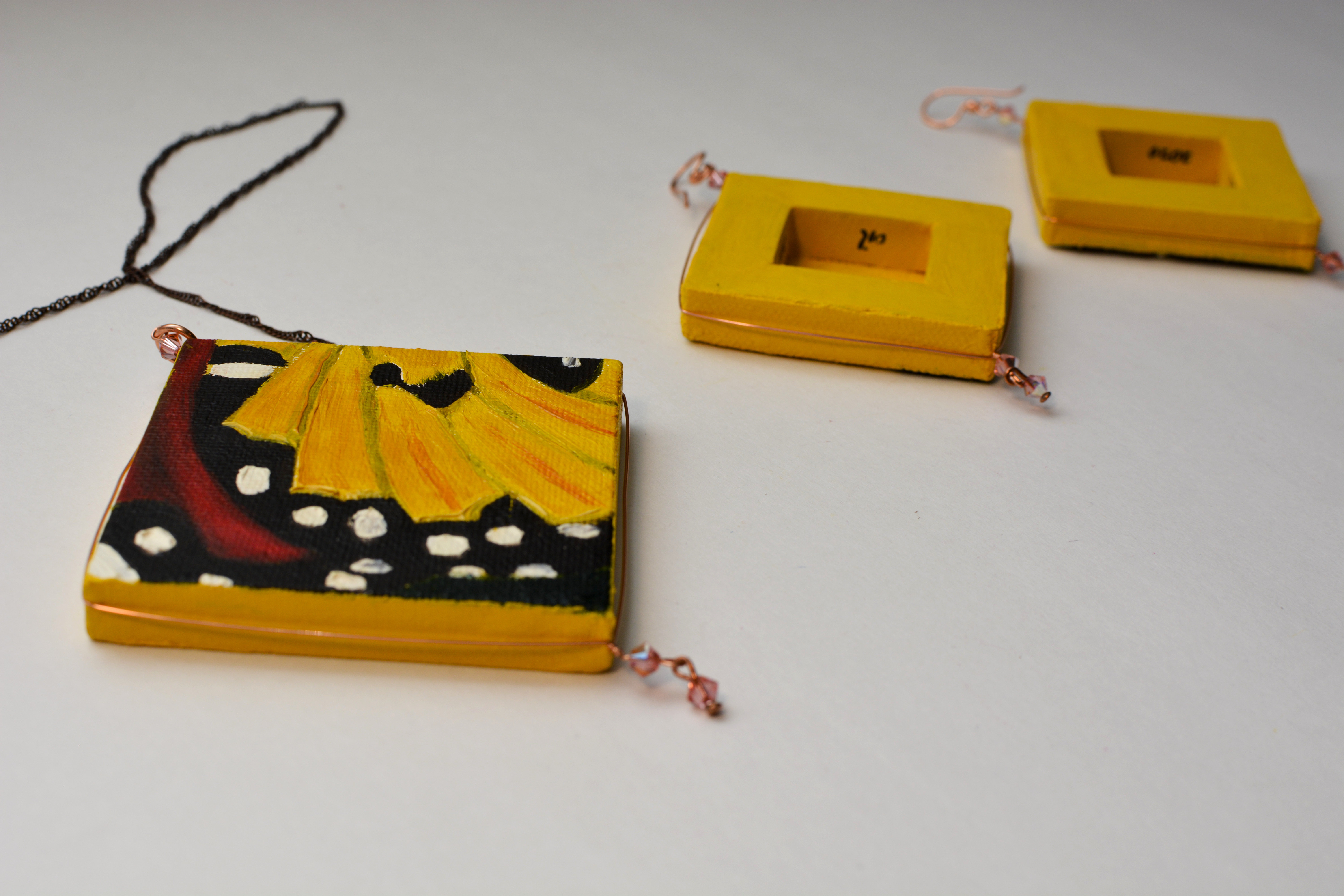 Dwudziestym drugim zestawem biżuterii malarskiej jaki prezentuje jest ,,Motyl XXII”. W tym zestawie elementy metalowe wykonane są z miedzi. Dla pogłębienia kontrastu zastosowałam lustra.