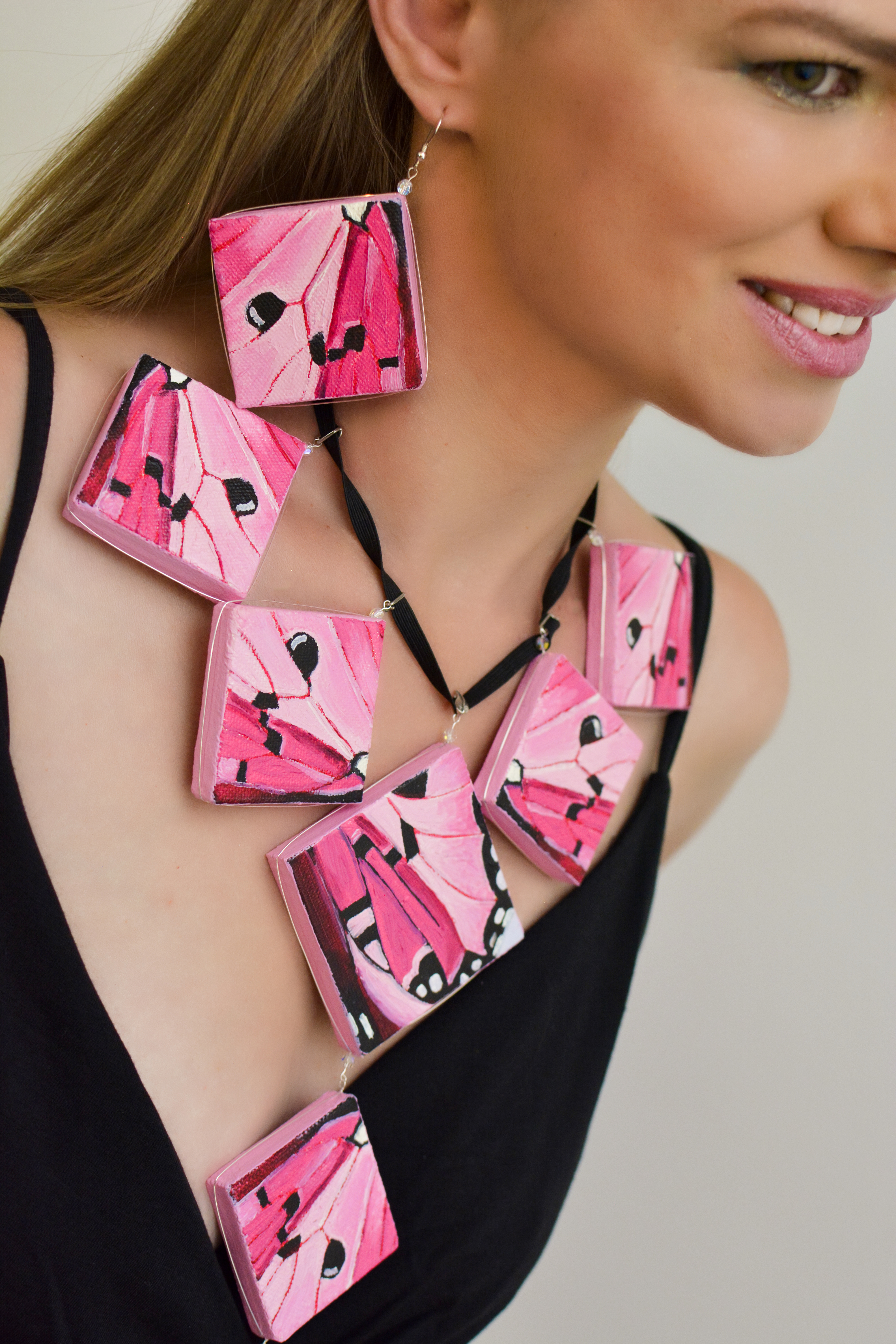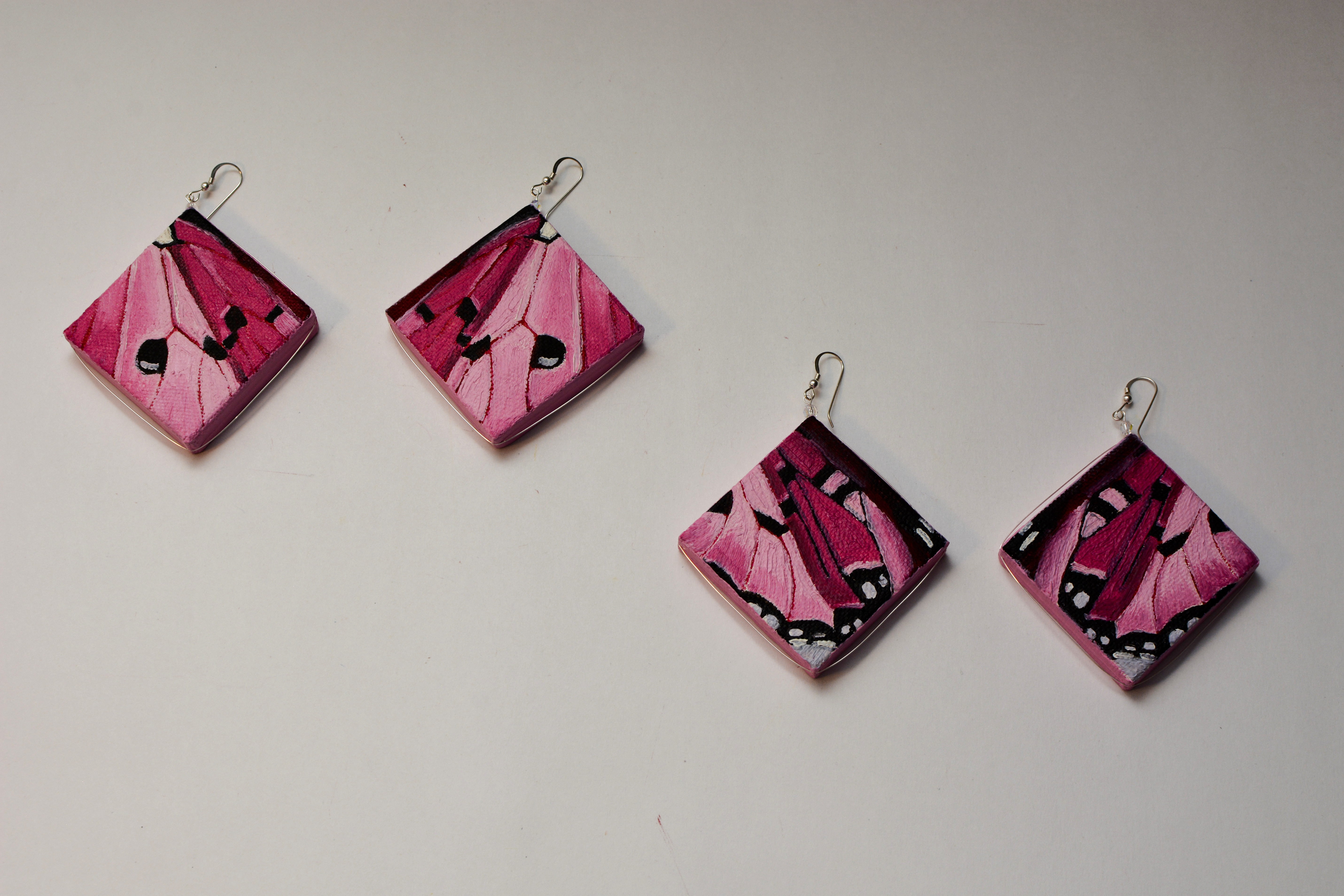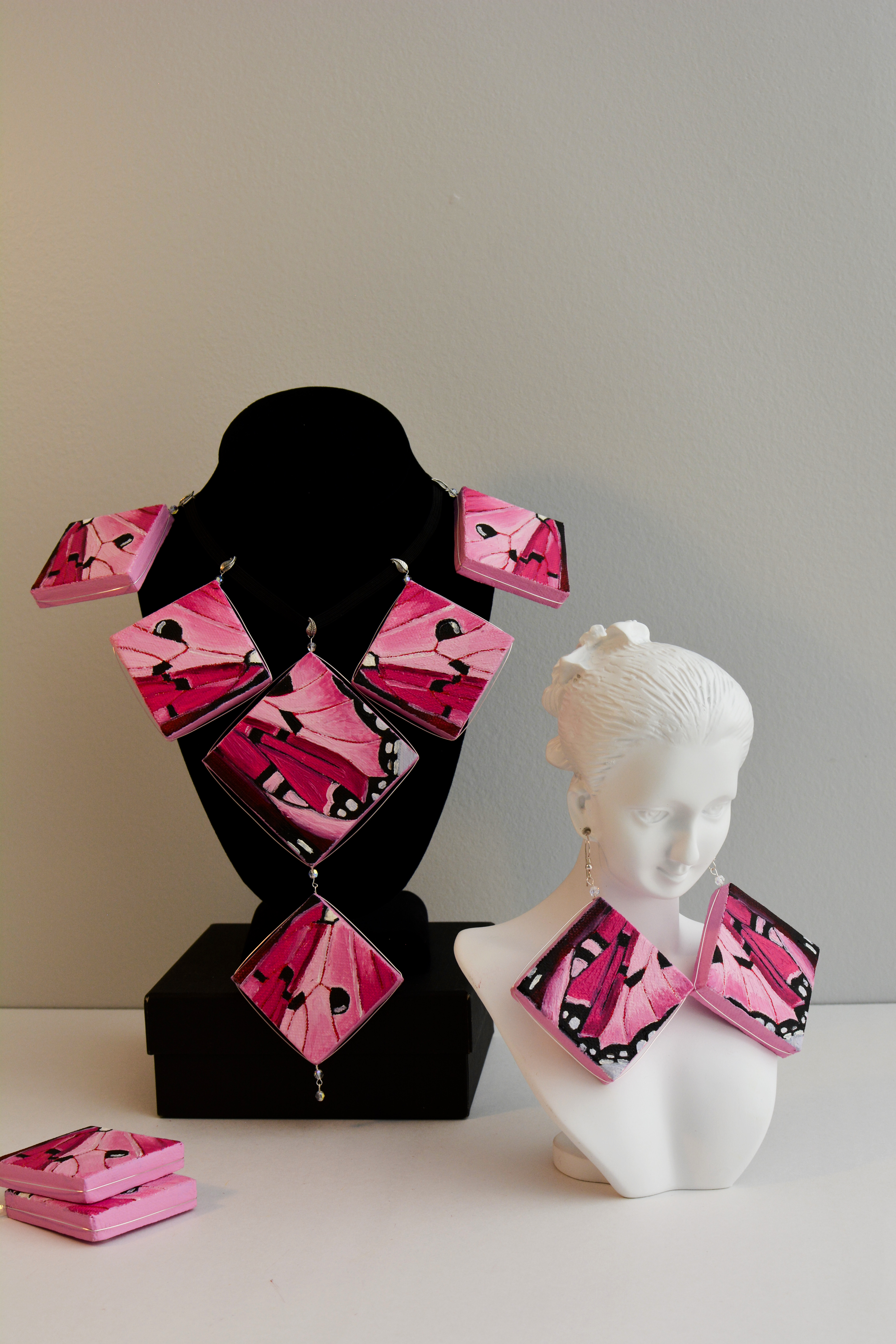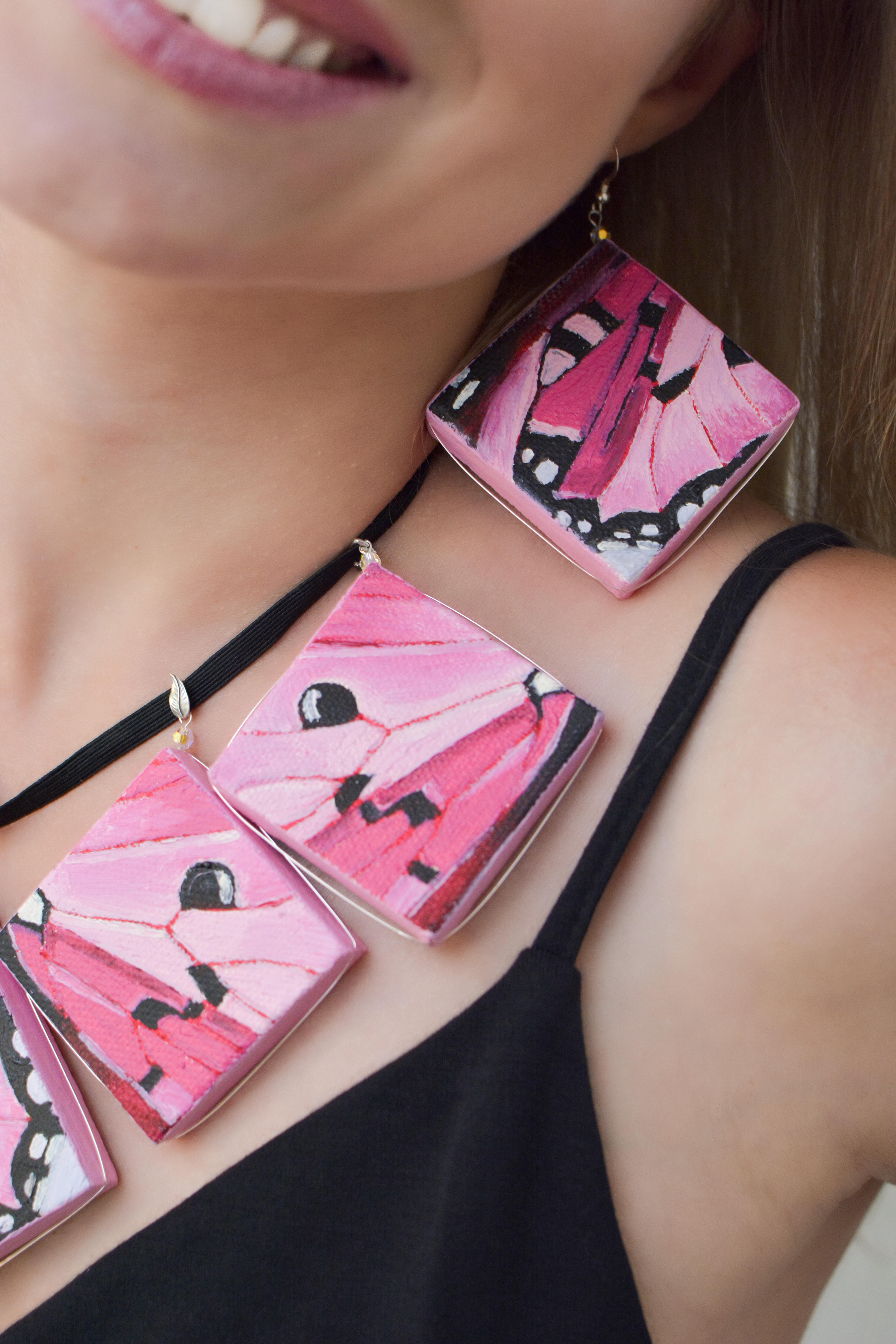 I used to dislike pink. Now I think every color is beautiful. Something for those who like pink. The twenty-third set of the painting jewelry I present is “Butterfly XXIII.” The metal elements are made of sterling silver in this set as well. To increase the contrast I have used mirrors.