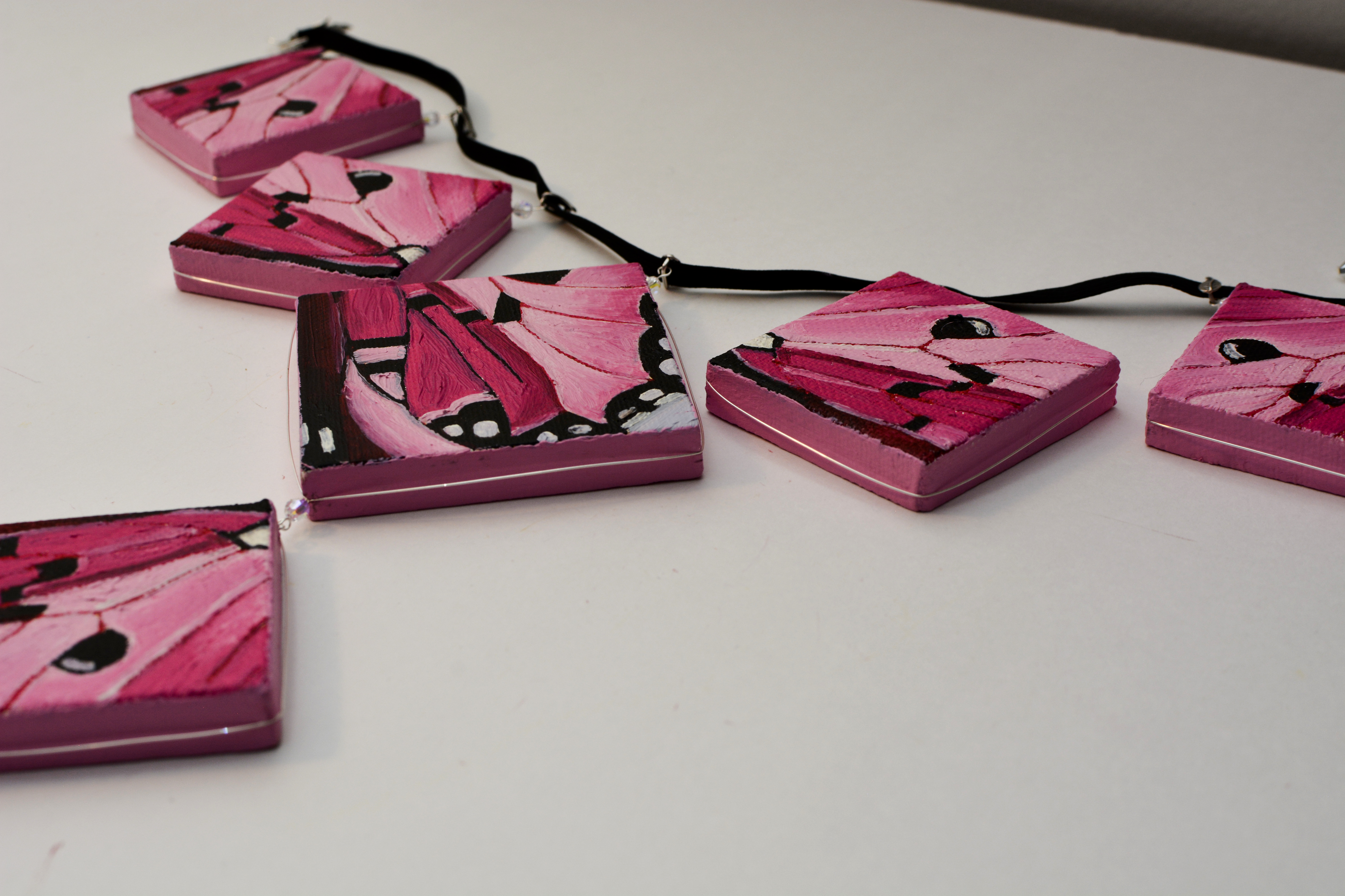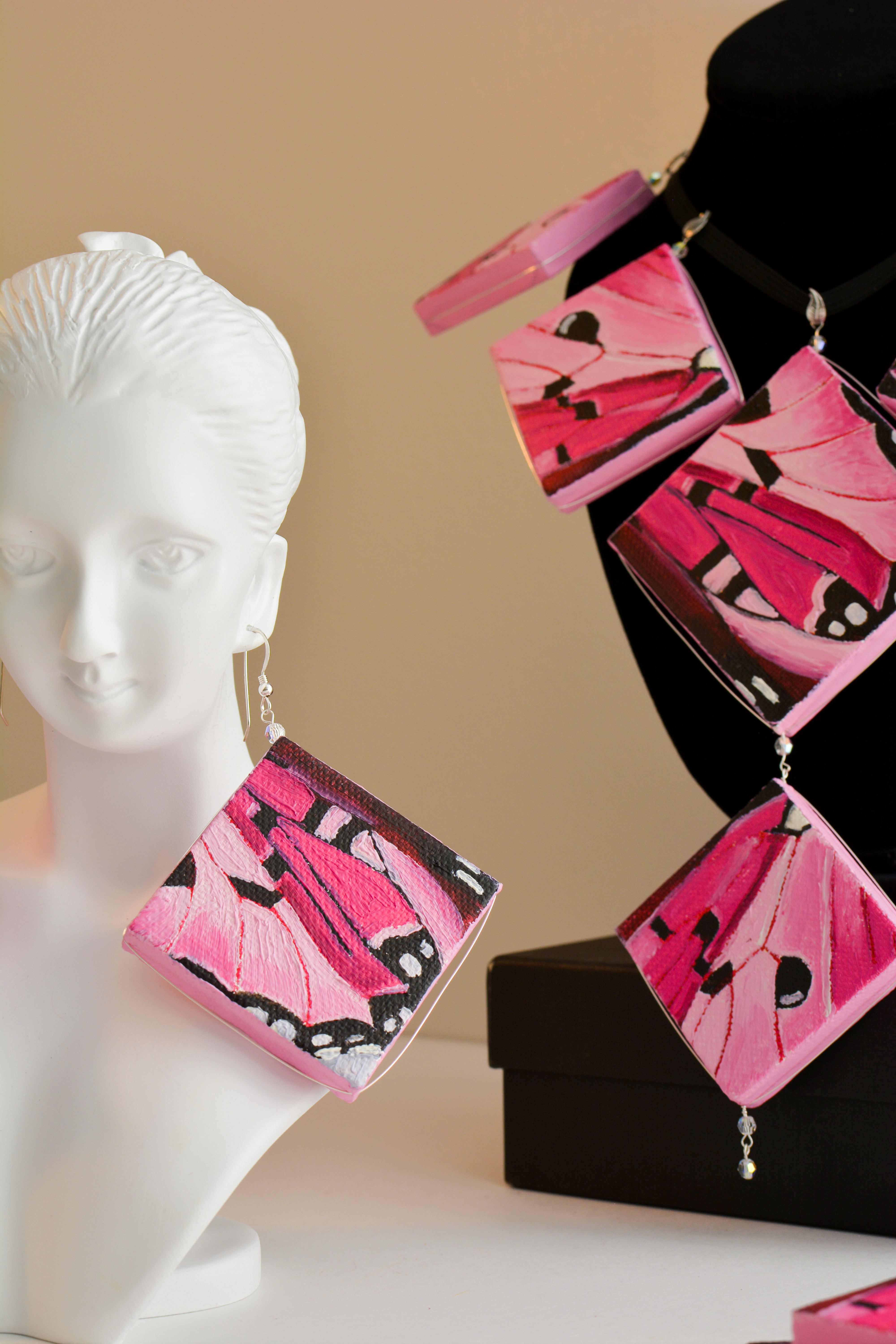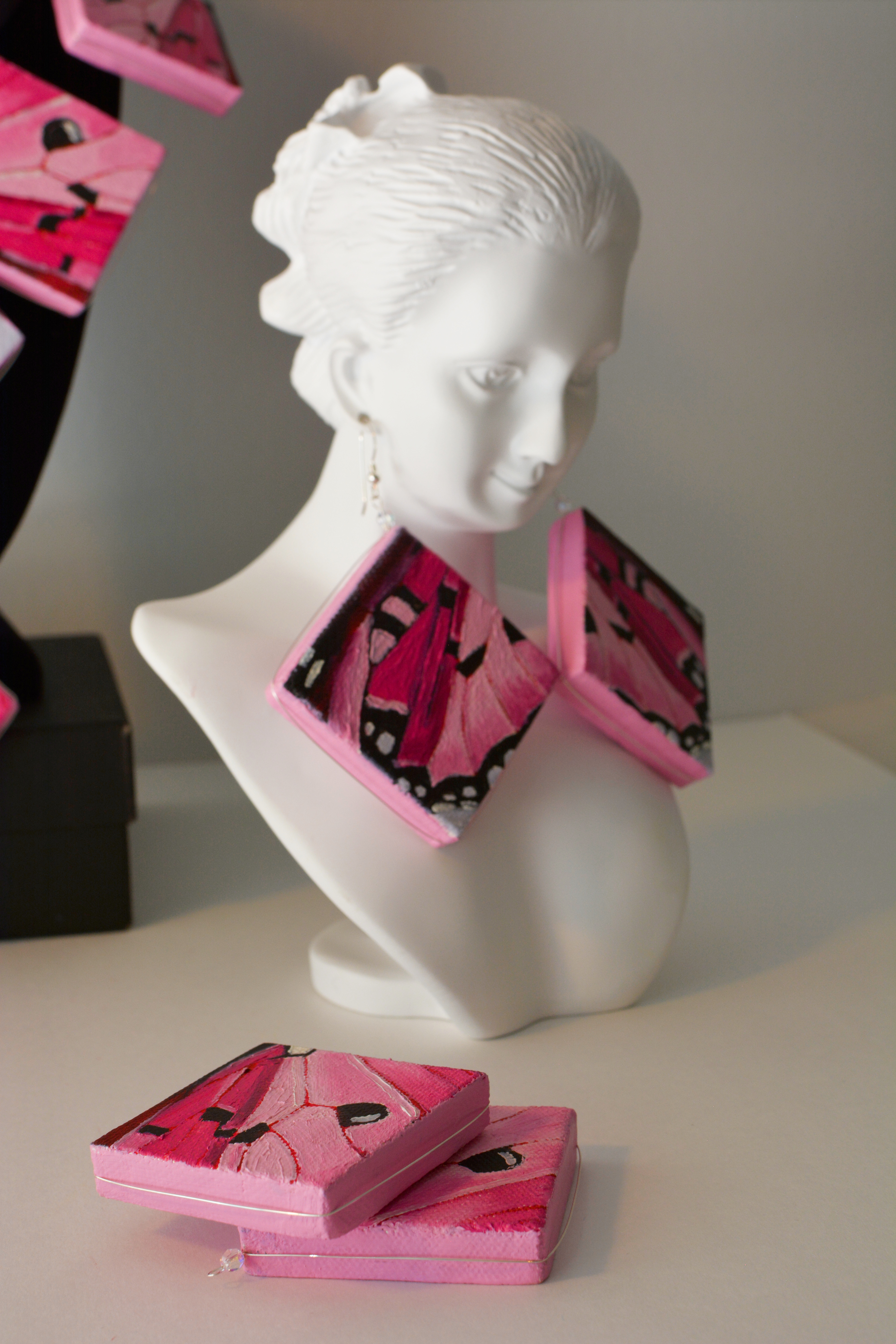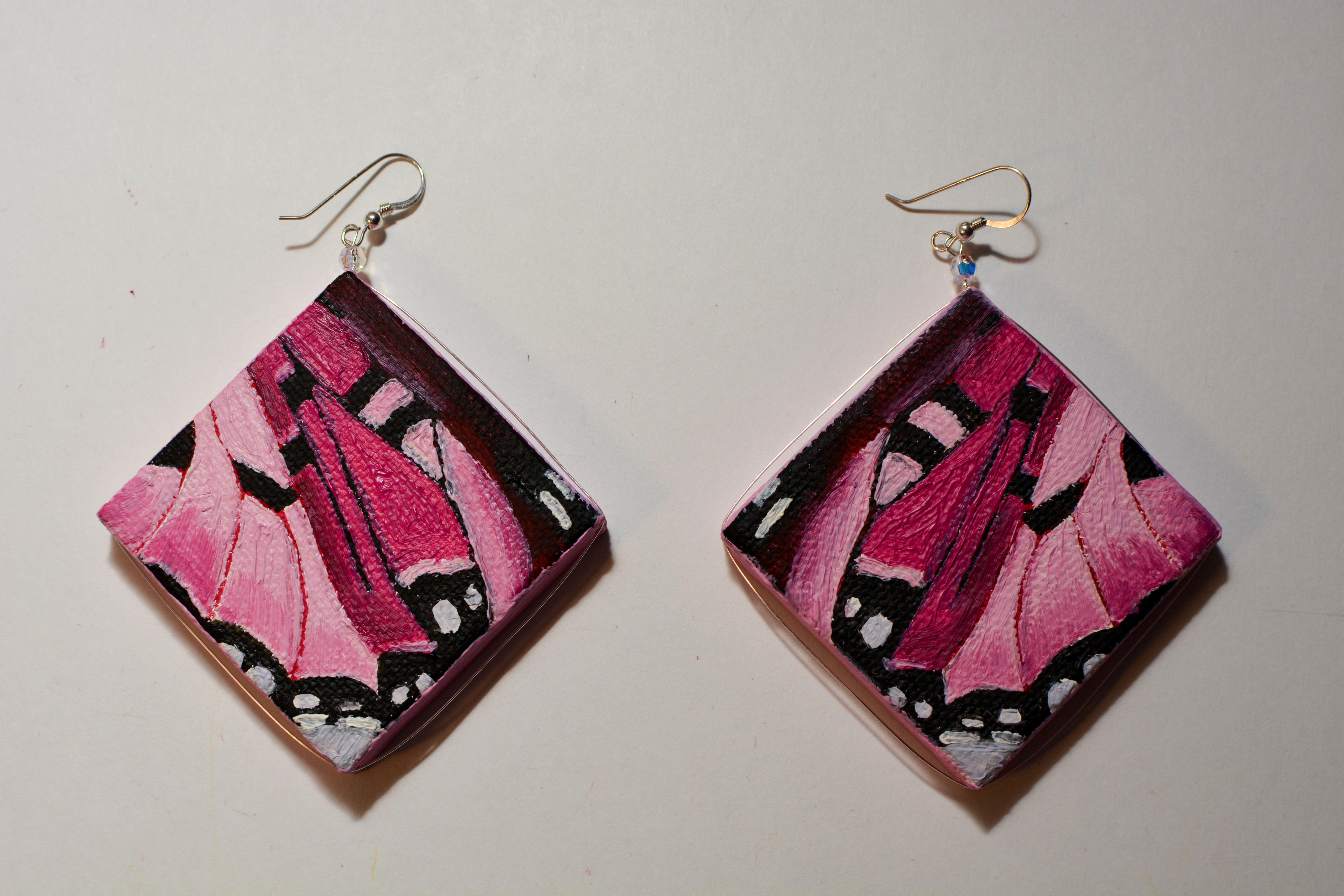 I used to dislike pink. Now I think every color is beautiful. Something for those who like pink. The twenty-third set of the painting jewelry I present is “Butterfly XXIII.” The metal elements are made of sterling silver in this set as well. To increase the contrast I have used mirrors.