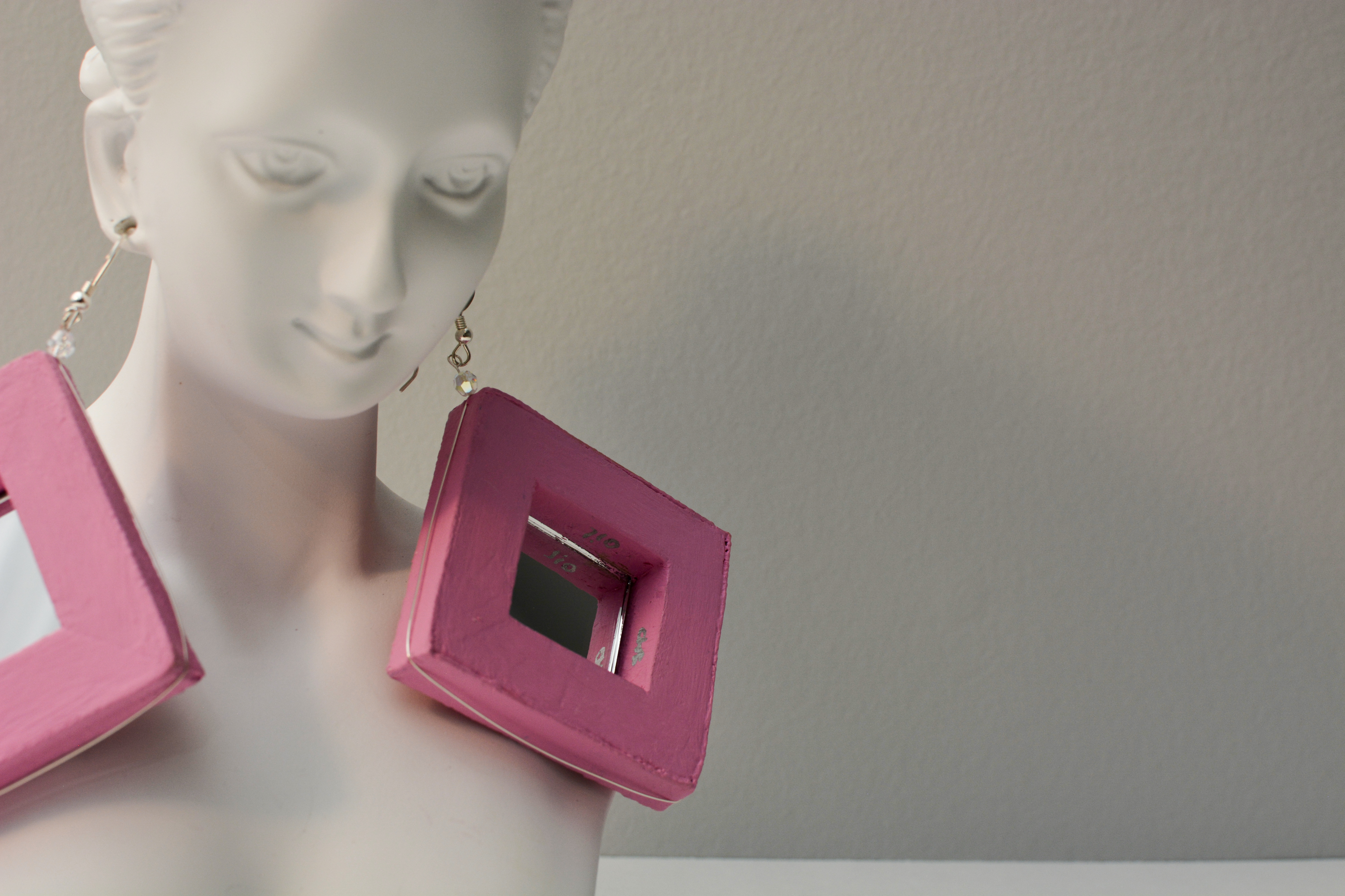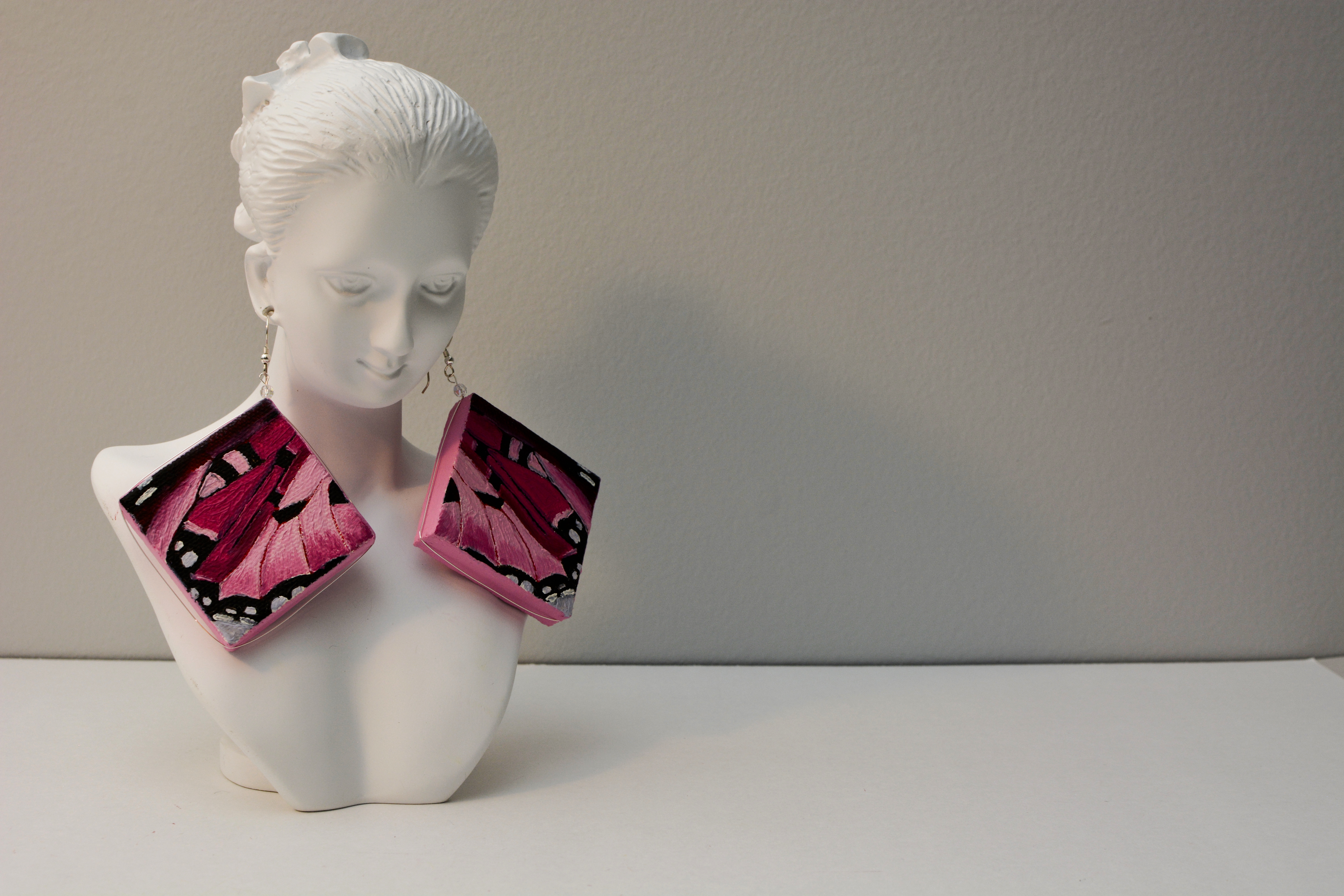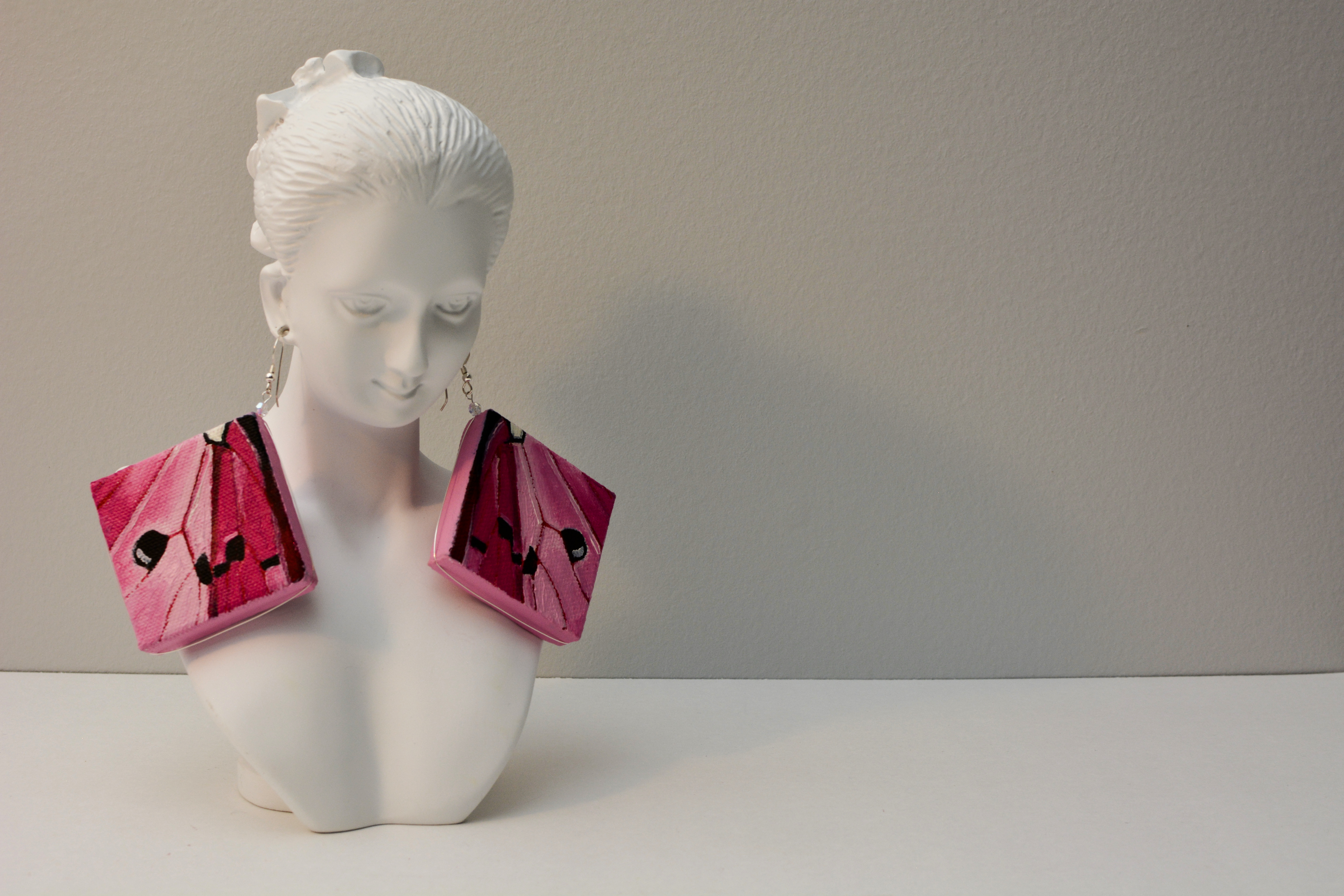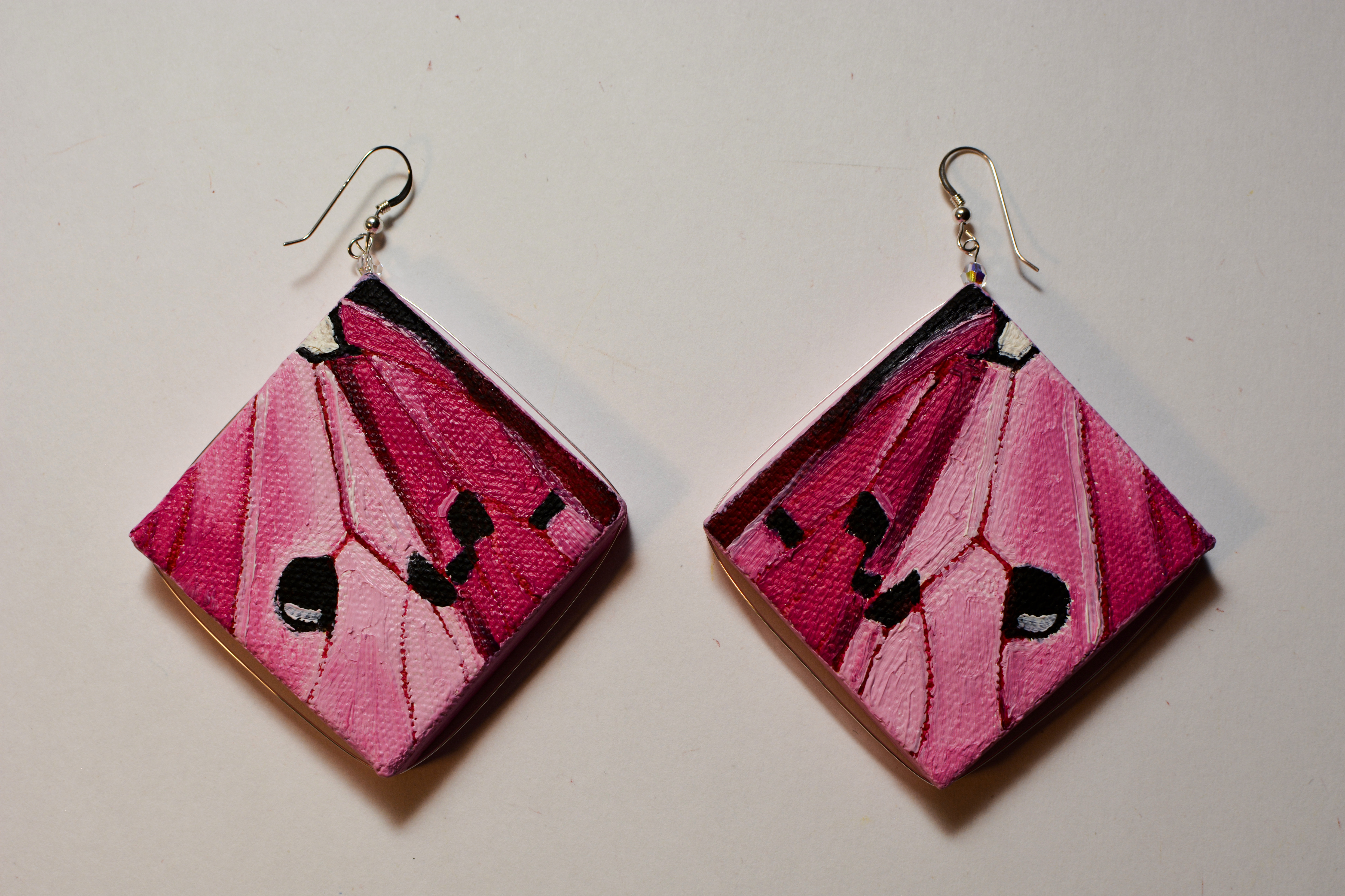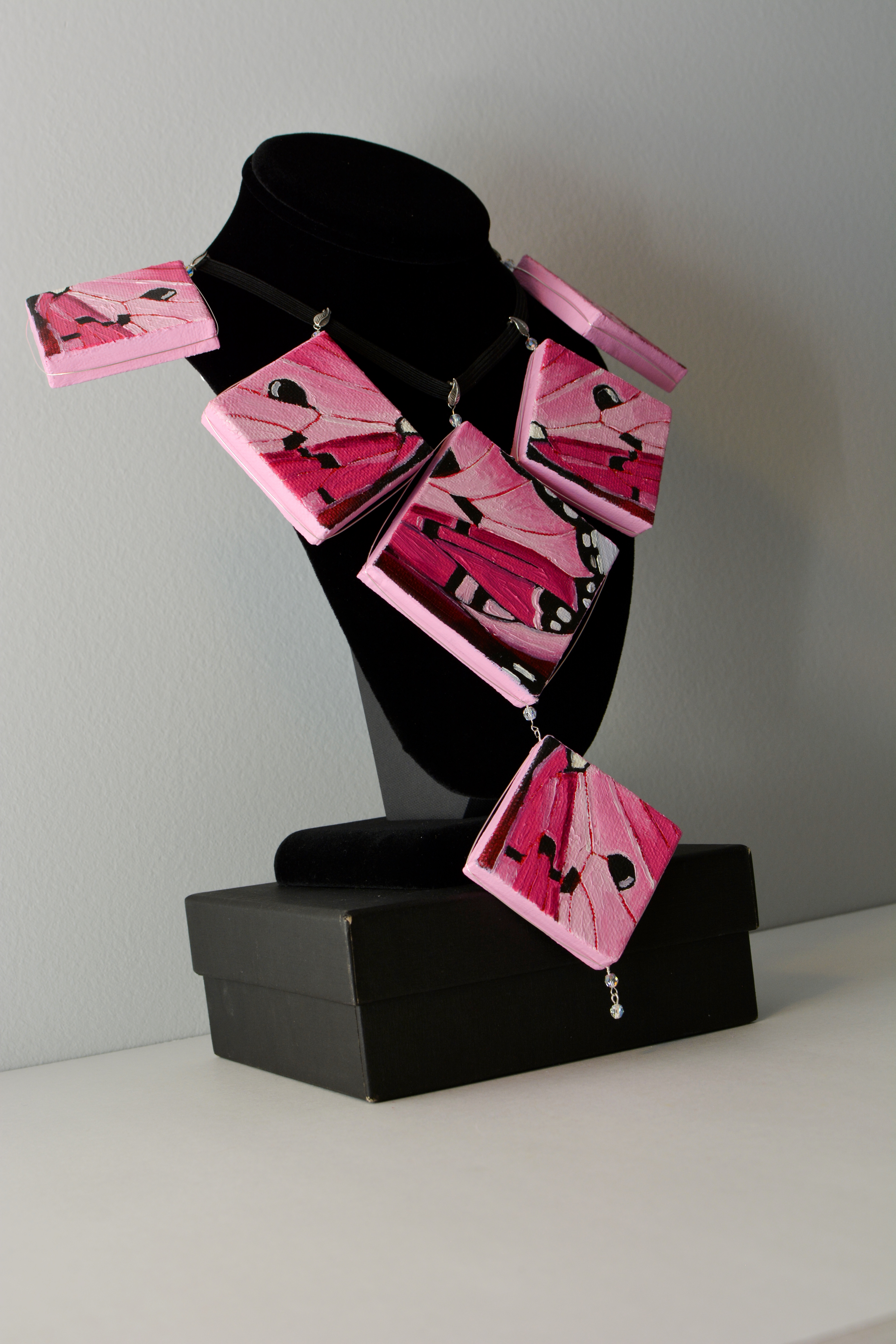 I used to dislike pink. Now I think every color is beautiful. Something for those who like pink. The twenty-third set of the painting jewelry I present is “Butterfly XXIII.” The metal elements are made of sterling silver in this set as well. To increase the contrast I have used mirrors.